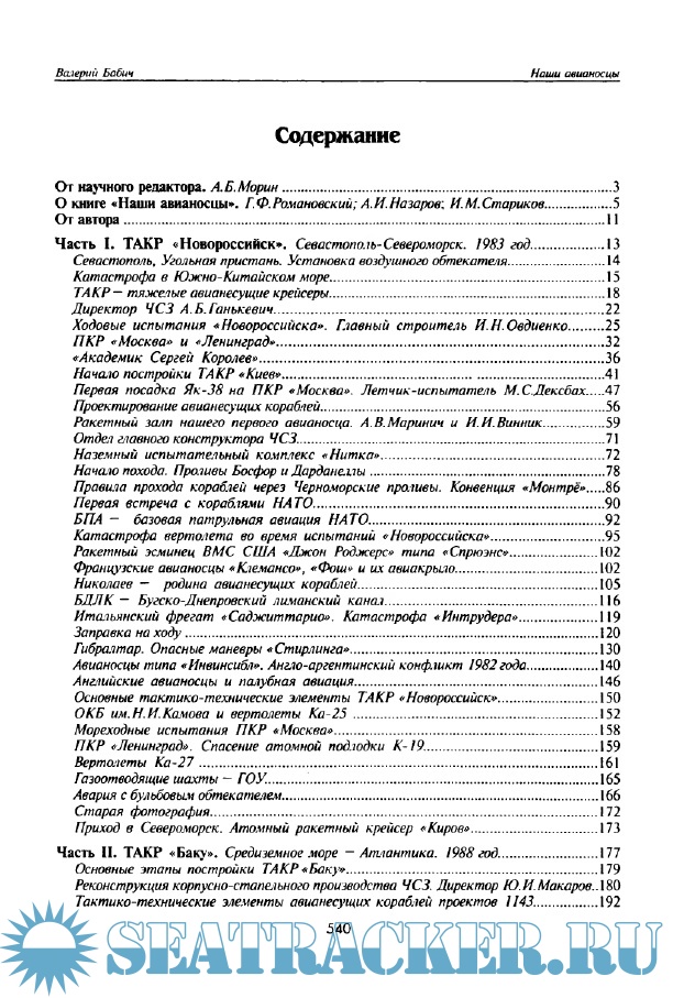 На фоне дневников двух походов ТАКР "Новороссийск" и "Баку" он в живой и увлекательной форме излагает историю создания наших авианесущих кораблей и развития корабельной авиации, отображает корабельный быт, попутно знакомя читателей с основными этапами развития и характеристиками иностранных авианосцев, а также с элементами других боевых кораблей (отечественных и иностранных).