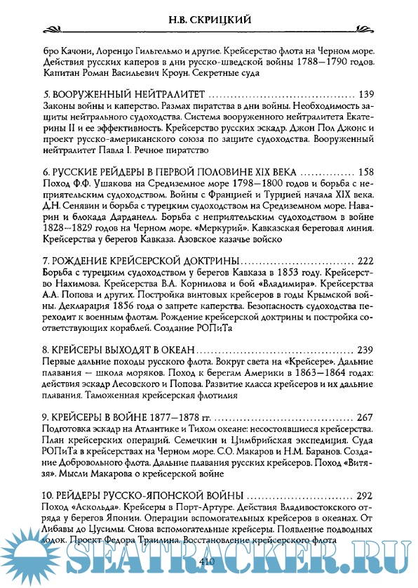 Описание: В книге Н.В.Скрицкого представлена история корсарства в России: походы русских князей в южные моря и речные ушкуйники Руси, каперские казачьи набеги на Черном и Каспийском морях в XVI-XVII веках и действия русских эскадр в Атлантике и на Тихом океане в XIX столетии. Не обойдены вниманием автора и крейсерские надводные и подводные операции начала XX века. Читатель найдет в тексте яркие эпизоды каперских рейдов знаменитых мореплавателей: Ф.Ф.Ушакова, Д.Н.Сенявина, П.С.Нахимова, Б.А.Корнилова, А.А.Попова, С.О.Макарова и др.