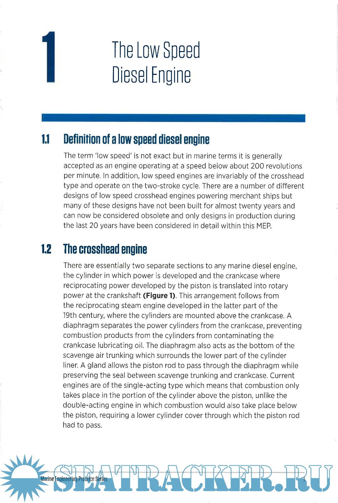 Description: This publication looks at the design and operation of crosshead-type marine diesel engines, covering engine construction, selection and installation: operation, monitoring and control: maintenance and malfunctions: and electronically controlled engines. Each topic is written in a clear and concise manner, with line drawings used to illustrate the text. Where there are fundamental differences in the design of components between different designers, drawings are provided to show how these designs compare.