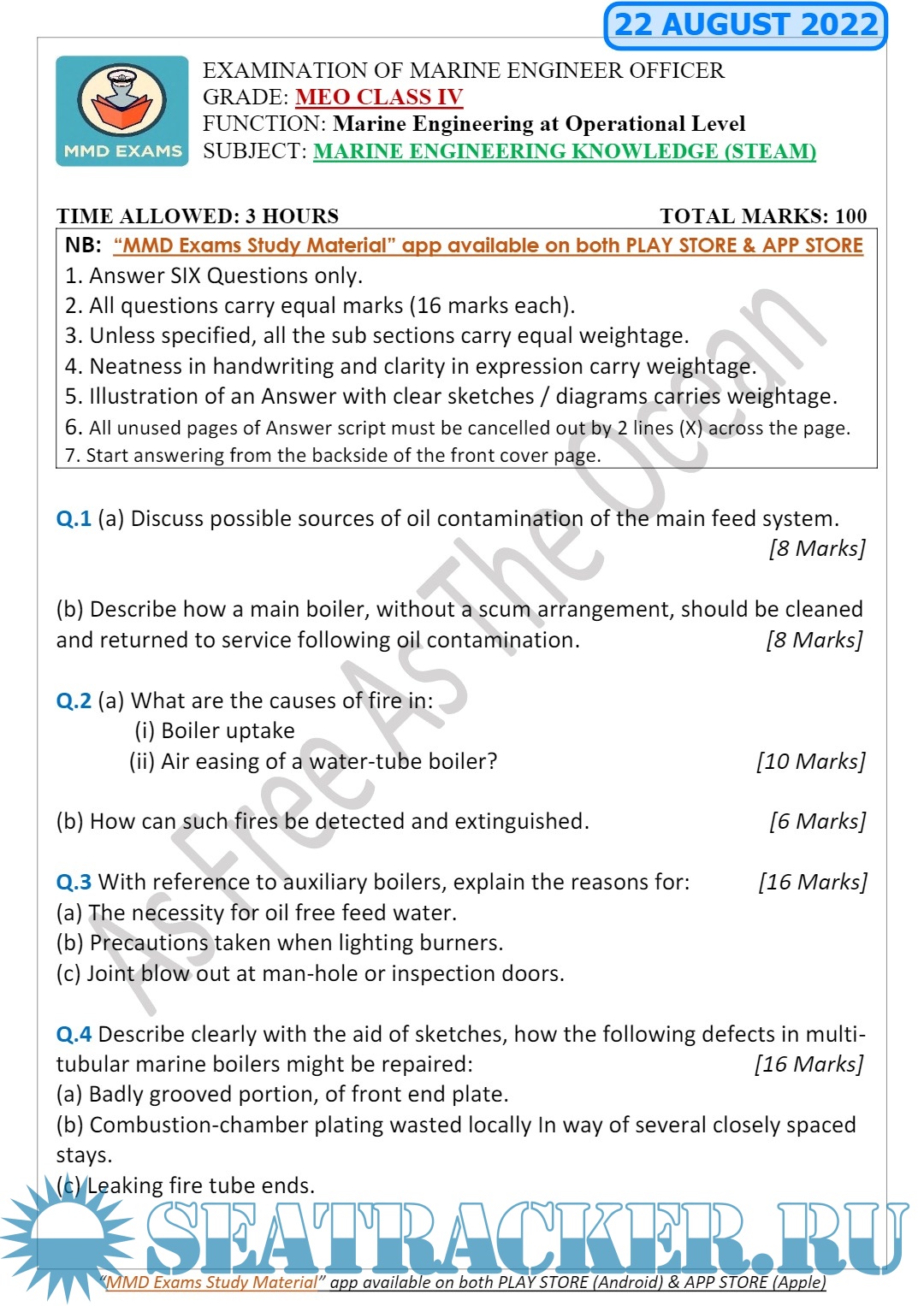 Question Paper Set for Marine Engineering Knowledge (M.E.K.) Steam (updated August 2022) for M.E.O.…