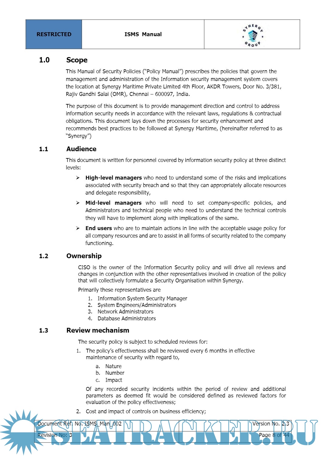 Description: The purpose of this document is to provide management direction and control to address information security needs in accordance with the relevant laws, regulations & contractual obligations. This document lays down the processes for security enhancement and recommends best practices to be followed.