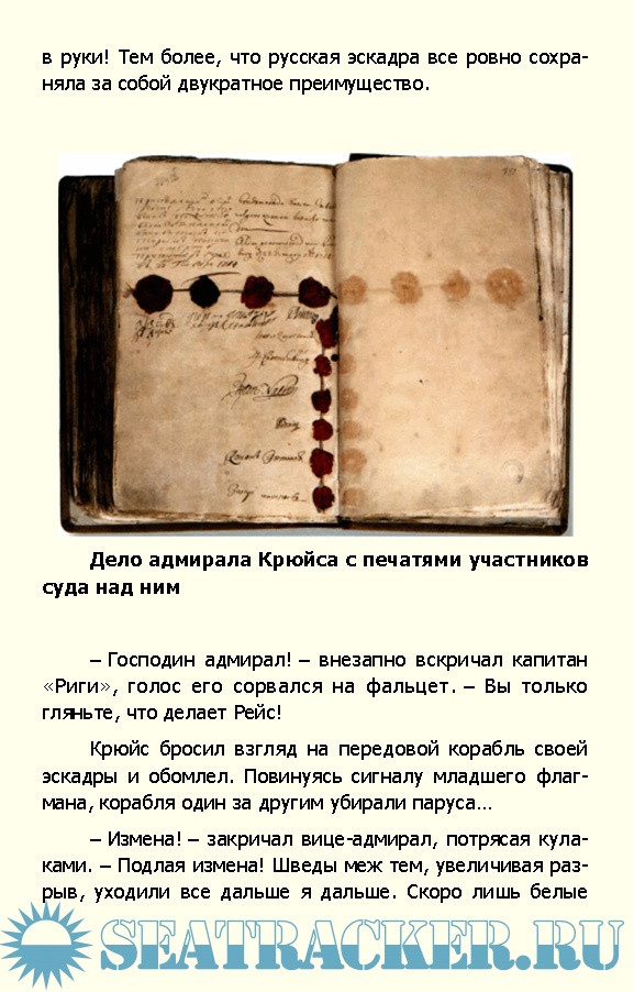 Интересная книга, которая рассказывает о создании впжного морского закона и его создателе Кононе Зотове. Петр I набирал капитанов из-за границы, и случилось одно событие, которое заставило Императора практически подойти к созданию морского устава. Событие, это 8 наших кораблей погнались за3-я шведскими и все говорило об успехе. Но вот флагманский корабль сел на камень, англичанин не понял сигнал голандский и также поставил второй корабль на камень, а младший флагман агличанин также не правильно прочитал голландский сигнал и прекратил погоню.