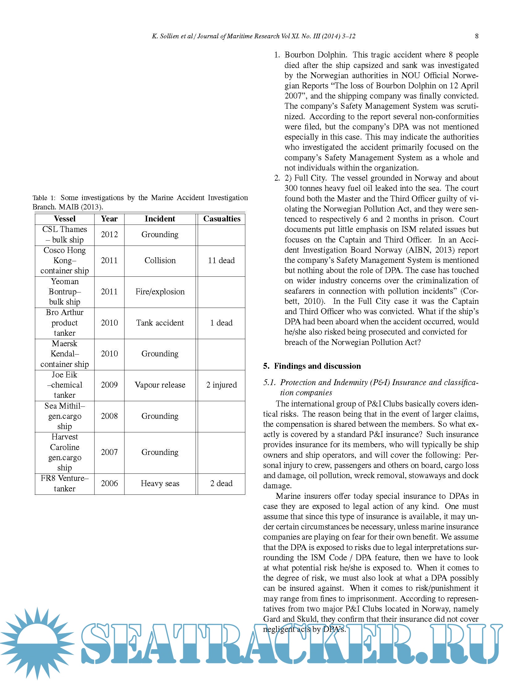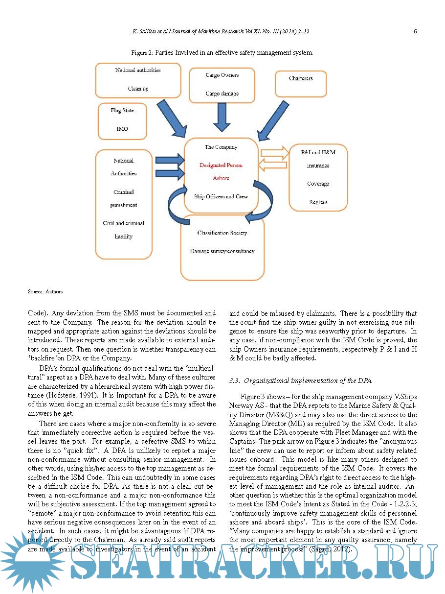 Year: 2014 Language: english Author: JOURNAL OF MARITIME RESEARCH Genre: Practical guide Format: PDF Quality: OCR with errors Pages count: 10 Description: This paper focuses on how the Designated Persons Ashore (DPAs) perceive their role in the shipping organization in relation to the International Safety Management Code (ISM) requirements and to which extent they are legally exposed in case of an accident. The ISM Code expects continuous improvement in safety on board. The DPA is responsible for determining the eectiveness of the safety management system within the company and onboard the ship. This paper seeks to enlighten the DPA’s role in the organization and the interpretation of the responsibility in relation to the ISM Code after an accident. The research questions are: (1) How do the DPAs perceive their position in the Company? ; (2) Can DPAs be legally exposed in case of an accident? ; (3) Can DPAs be charged with negligence?; and (4) Do DPAs need a special insurance? The method used is interviews with four DPAs working for shipping companies and two other experts in this field. In addition to this, e-mail exchange with other professional bodies, discussions with active DPAs and study of relevant literature. The results of the analysis show the absence of recent debate in this field and little attention from the accident reports. Further, one weakness of the ISM Code seems to be that it does not clearly define what is “top management” and therefore does not make clear demands on how high up in the system to DPA should report. This paper shows that to succeed in this role as a DPA he/she is dependent of a good cooperation with other departments in the organization and full support from top management.