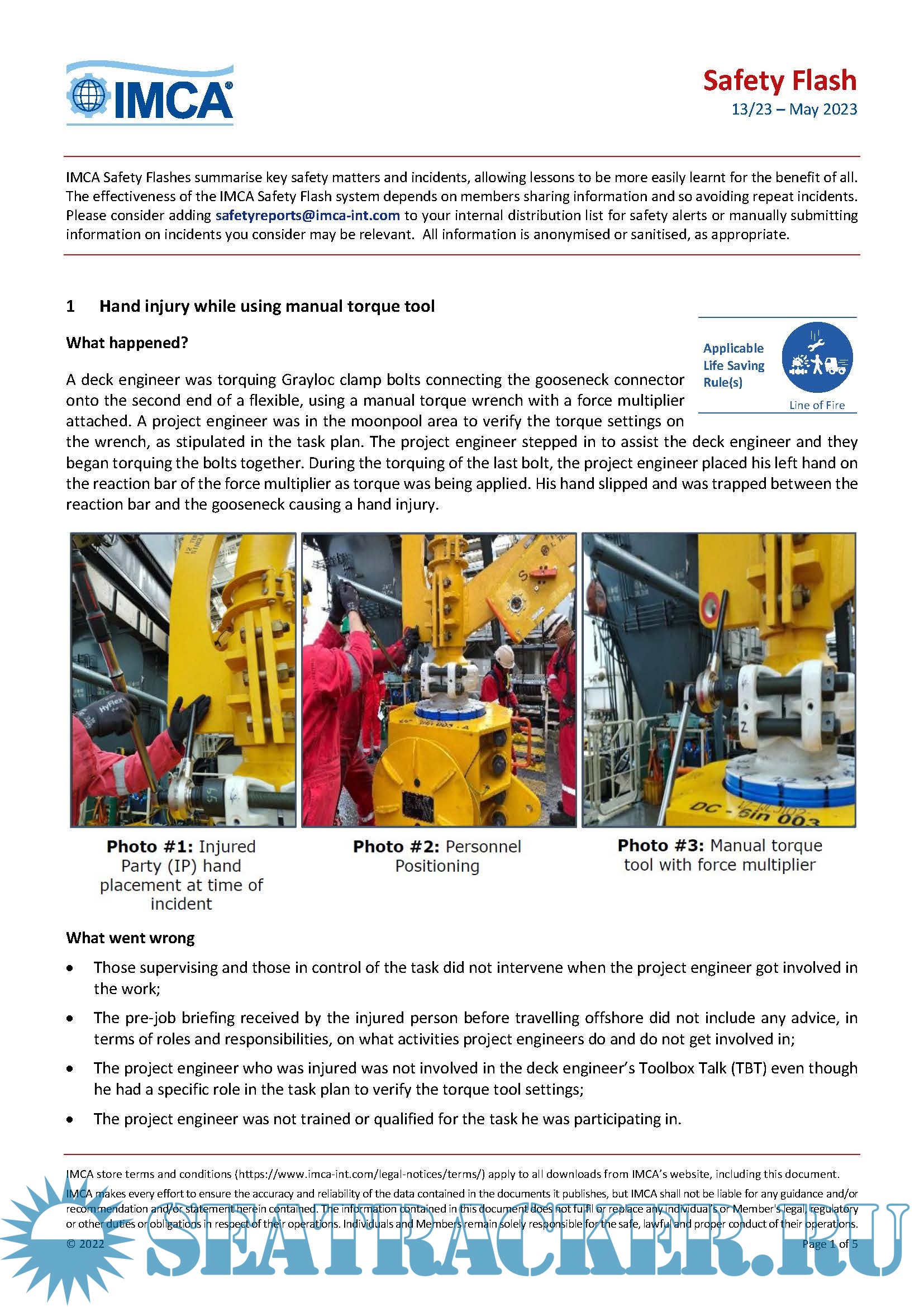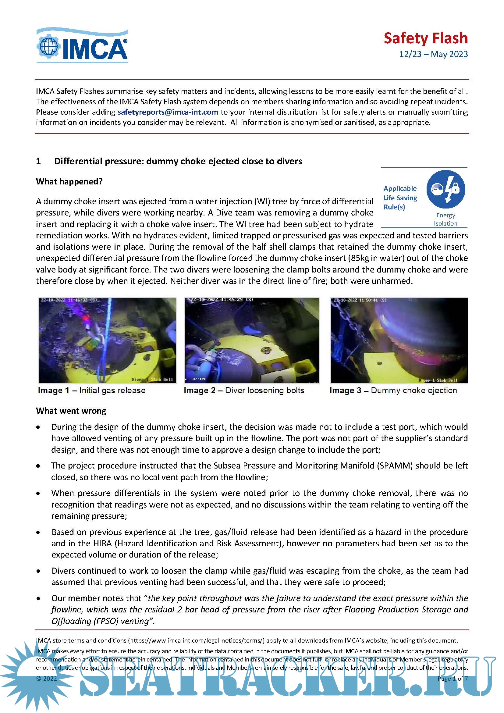 Description: The International Marine Contractors Association ( IMCA ) Safety Flashes disseminate important information on incidents and potential hazards and the lessons learnt from them that can help prevent incidents occurring elsewhere in the industry.IMCA Safety Flashes and systems for incident reporting and analysis are an important tool for sharing vital information.By publishing them, IMCA helps its members around the world identify potential hazards, share lessons learned and avoid repetition.Safety Flashes should be succinct, specific, factually correct and written in clear language.The Secretariat will assist with this through formatting and checking of the material submitted.