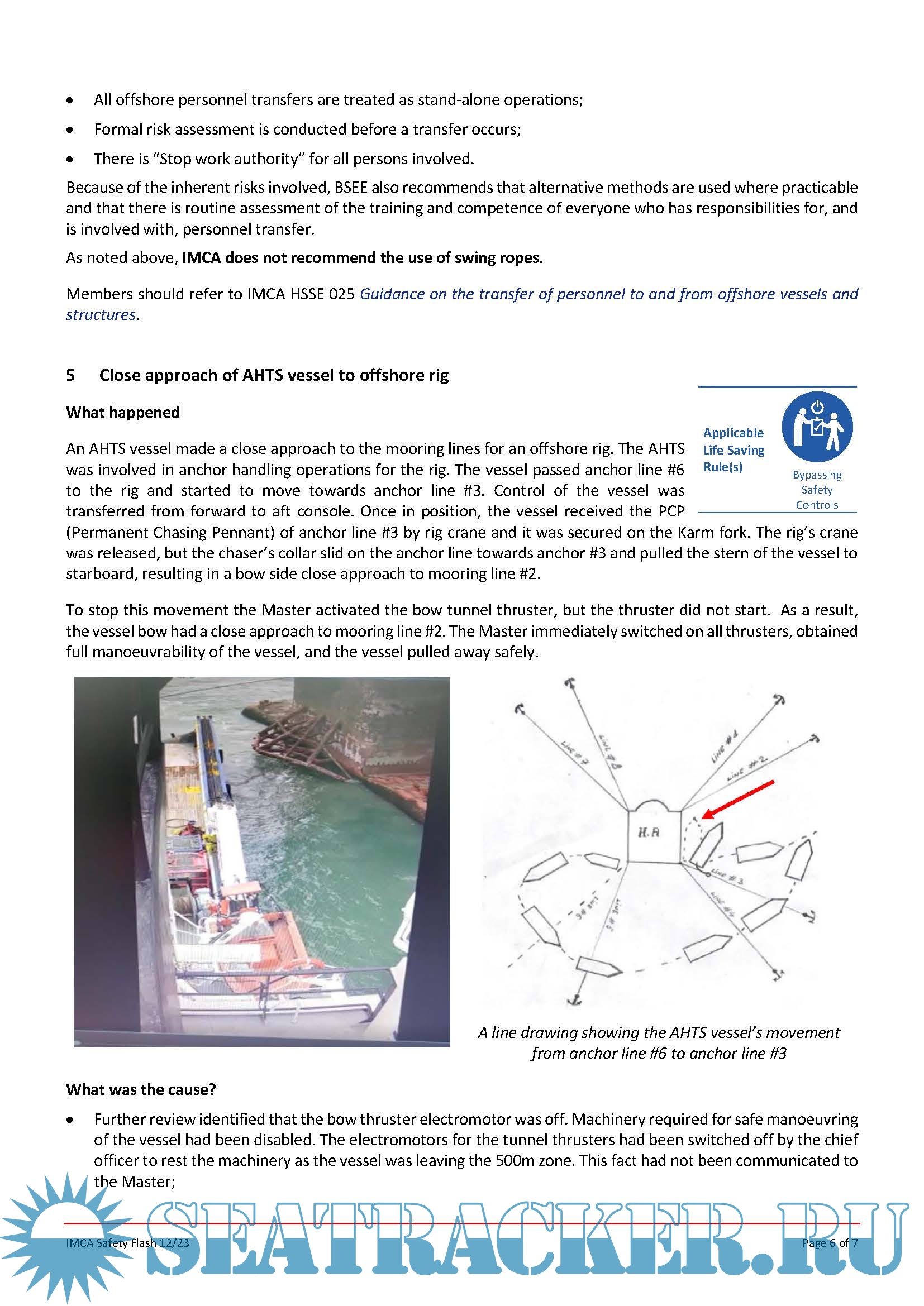 IMCA SF 13/23 Hand injury while using manual torque tool Loss of redundancy in diving bell launch and recovery (LARS) PLC system Hand injury in medical airlock Painter line snapped and hit crew member in the face MSF: Disposable vape self-ignition IMCA SF 12/23 Differential pressure: dummy choke ejected close to divers Crane boom stopper fell to main deck Fire alarm activation in engine room BSEE: Swing rope transfers Close approach of AHTS vessel to offshore rig