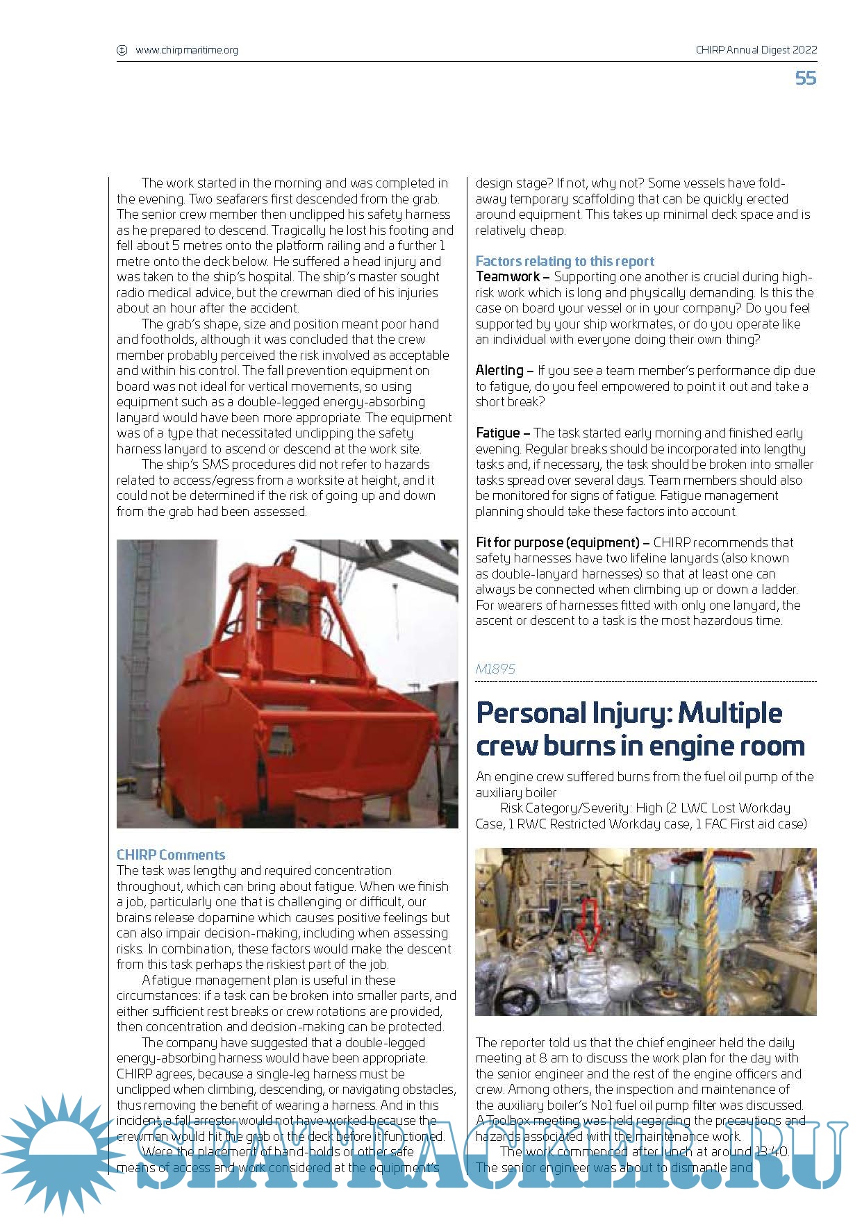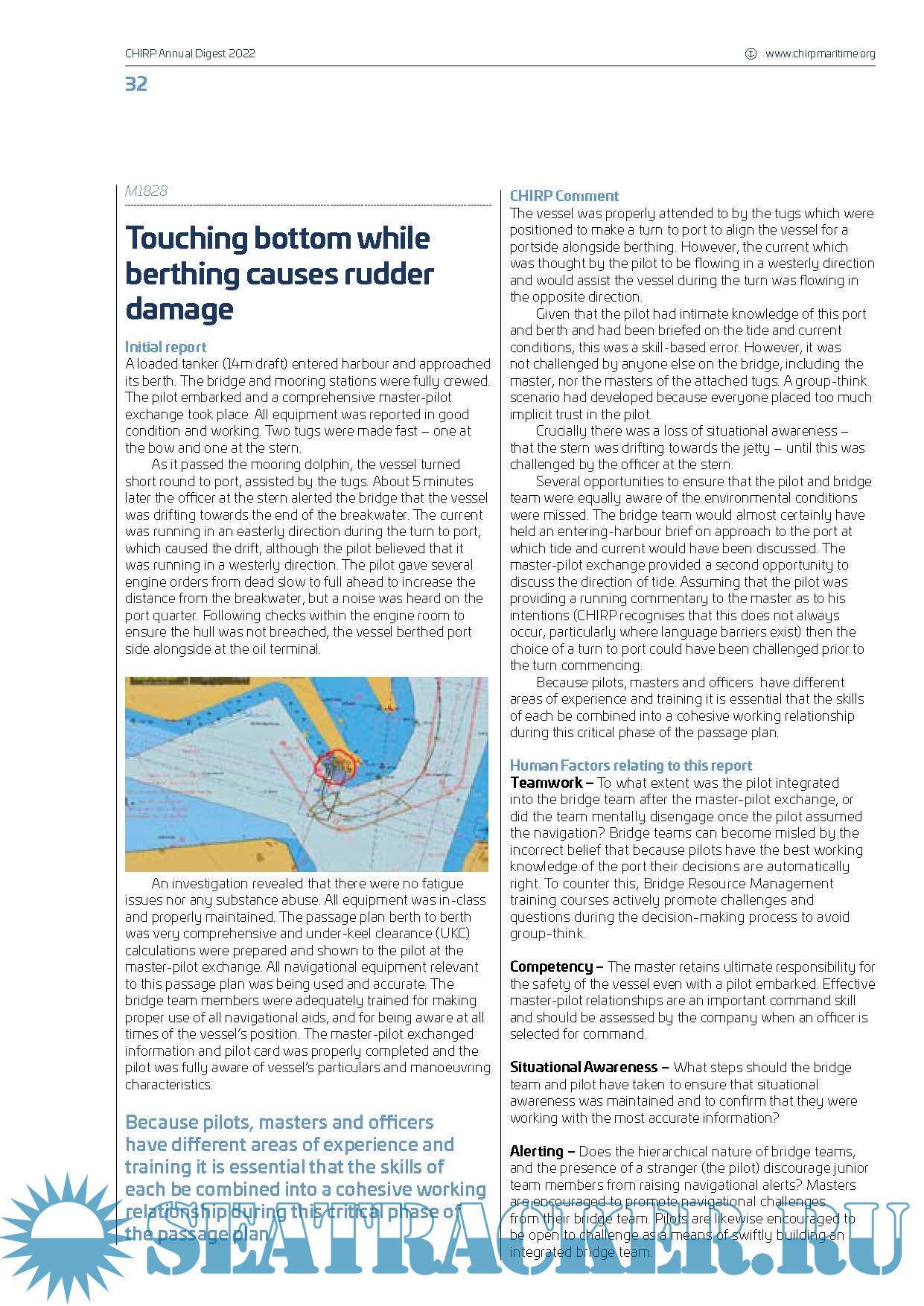 Year: 2023 Language: english Author: CHIRP Maritime Genre: Periodical Format: PDF Quality: eBook Pages count: 70 Description: This publication contains summaries of all cases published by CHIRP (Confidential Human Factors Incident Reporting Programme) during 2022. CHIRP Maritime aims to improve maritime safety by providing an independent and confidential reporting system for all individuals employed in or associated with the industry, analysing data and identifying safety trends and informing the community of safety related reports and trends. The Digest categorises incidents according to human factors, deck safety, engineering, technological, environmental, pilotage, COLREGs/navigation, safety culture and health and etc