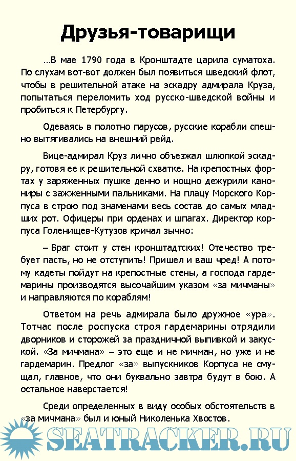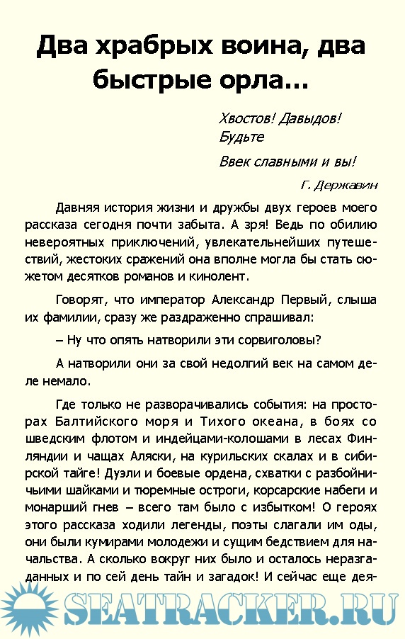 Описание: История двух закадычных друзей могла бы стать сюжетом целой серии приключенческих романов и телевизионных сериалов, представлена в книге известного писателя-мариниста капитана 1 ранга Владимира Шигина. Офицеры Балтийского флота лейтенант Хвостов и мичман Давыдов являлись не только храбрыми моряками, отличившиеся в русско-шведской войне 1808-18709 годов, но исследователями Аляски и отважными мореплавателями. Именно они командовали легендарными судами «Юнона» и «Авось», сопутствовали камергеру Рязанову в его плавании в Калифорнию и роману с испанкой Кончитой. Хвостов и Давыдов изгнали японских захватчиков с Курильских островов и водрузили там российский флаг. Помимо этого, оба были талантливыми литераторами и поэтами. Тайна их странной смерти не раскрыта и по сегодняшний день.