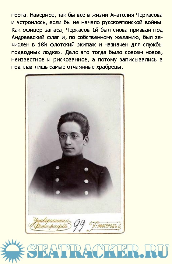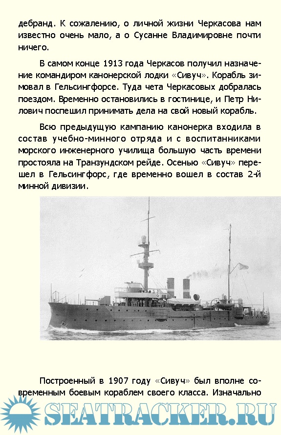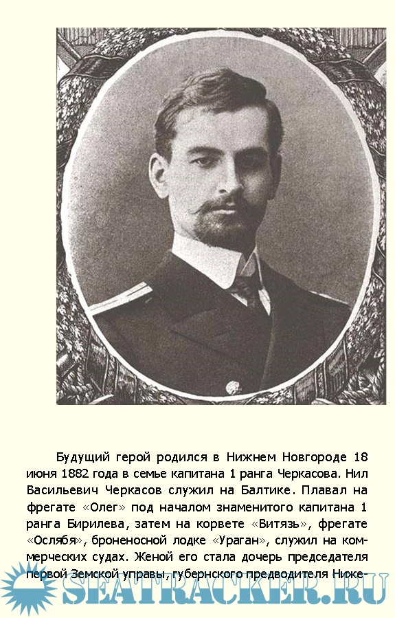 Описание: В многочисленной плеяде героев нашего флота капитан 2 ранга Петр Черкасов занимает особое место. Подвиг его был высок и жертвенен, но ныне, к сожалению, почти забыт. Начавшаяся вскоре череда революций и братоубийственная Гражданская война привнесли иных «героев» нового времени. И все же и сегодня, спустя столетие подвиг, совершенный Петром Ниловичем Черкасовым не может не вызывать восхищения и преклонения перед его памятью.