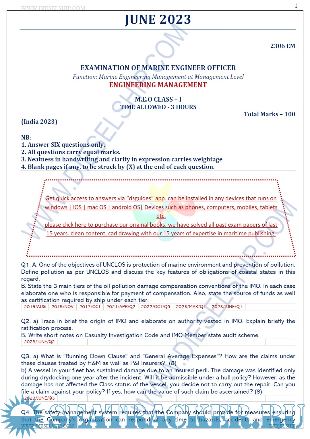 Year: 2023 Language: english Author: Dieselship Format: PDF Quality: eBook Pages count: Multiple Description: M.E.O. Class I Question Paper set for Mercantile Marine Department (MMD), D.G. Shipping India Exams.