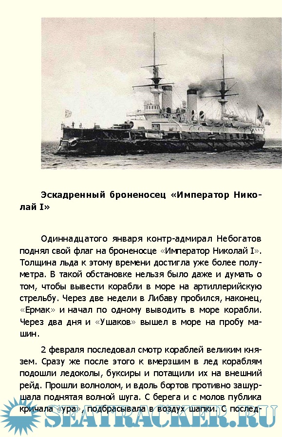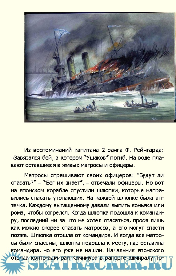 Капитан 1 ранга Владимир Николаевич Миклуха – командир броненосца «Адмирал Ушаков». Цусимский бой стал для него, как и для многих тысяч других русских моряков, последним. Командир «Адмирала Ушакова» предпочел смерть позору плена. На флагах его гибнущего корабля до самой последней минуты развевался флажный сигнал «Погибаю, но не сдаюсь…»