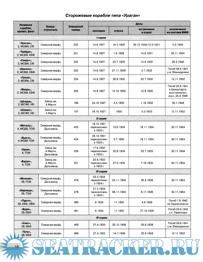 С этих сторожевиков началось возрождение отечественного кораблестроения, почти полностью уничтоженного в годы Гражданской войны и разрухи. За свои "штормовые" имена СКР типа "Ураган" получили шутливое прозвище "кораблей плохой погоды". Созданные в рамках первой сталинской судостроительной программы 1926-1931 гг., эти сторожевики предназначались для охраны линкоров от ударов подводных лодок и торпедных катеров противника, а также для дозорной и разведывательной службы, сопровождения конвоев и постановки минных заграждений. Но в годы советско-финляндской, Великой Отечественной и советско-японской войн "ураганы" применяли еще и в качестве эскортных миноносцев, кораблей артиллерийской поддержки, быстроходных транспортов и десантных судов. Не уступая лучшим зарубежным аналогам, эти сторожевики оказались одними из самых востребованных боевых единиц нашего флота и отличились на всех театрах военных действий - от Северного моря до Черного и от Балтики до Тихого океана.