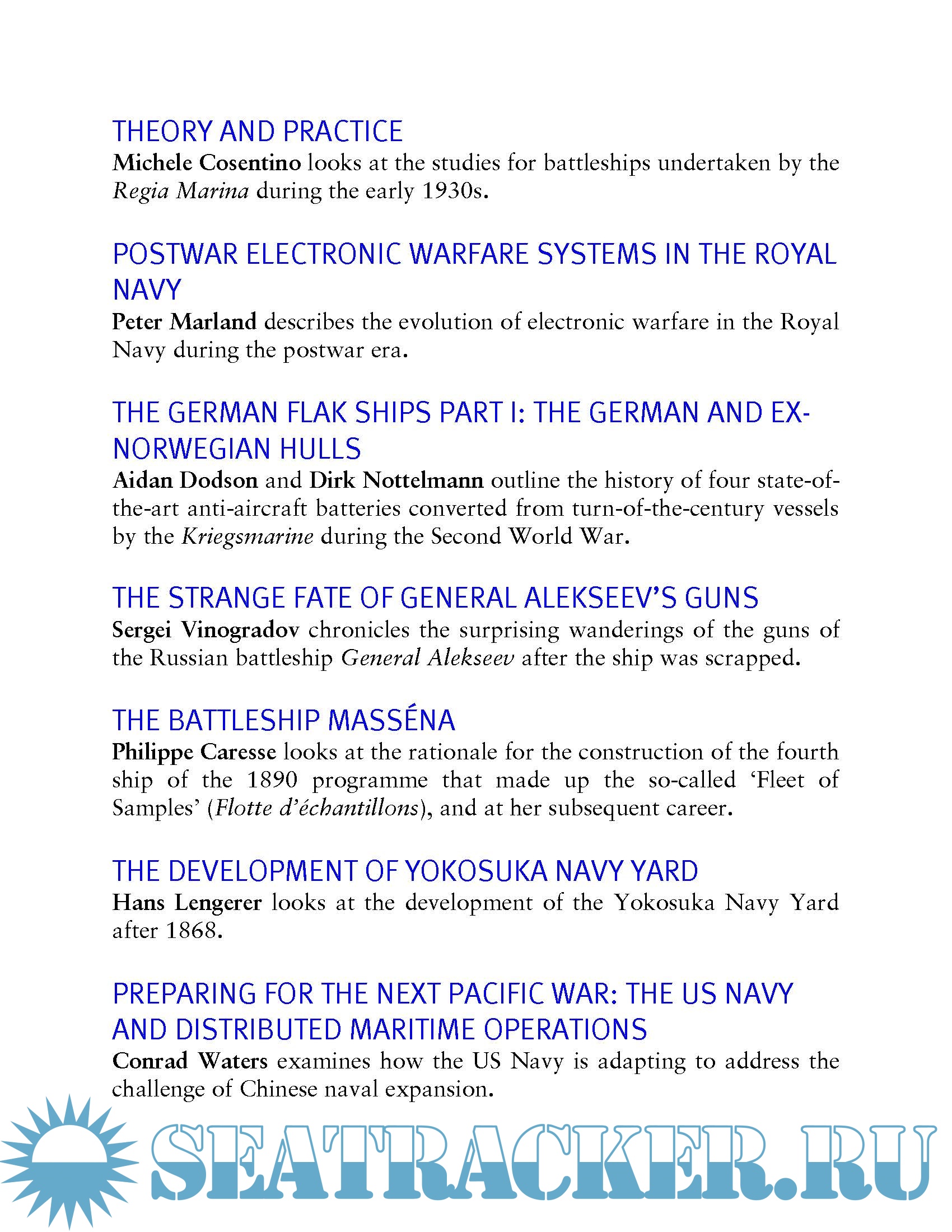 This year's Warship includes features on the secret battleship design that Mussolini's Fascist Italy sold to Stalin's USSR, the little-known German flak ships of World War II, the French aircraft carriers Clemenceau and Foch, and the development of electronic warfare in the Royal Navy.