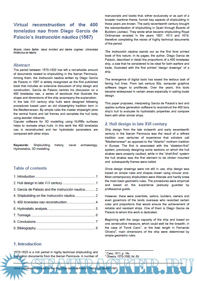 Year: 2023 Language: english Author: Ricardo Visiers Genre: History Format: PDF Quality: eBook Pages count: 8 Description: The period between 1570-1620 has left a remarkable amount of documents related to shipbuilding in the Iberian Peninsula. Among them, the Instrucción náutica written by Diego García de Palacio in 1587 is widely recognized as the first published book that includes an extensive discussion of ship design and construction. García de Palacio centres his discussion on a 400 toneladas nao, a series of woodcuts that illustrate the shape and dimensions of the ship accompany the explanation. In the late XVI century ship hulls were designed following procedures based upon an old shipwrightry tradition born in the Mediterranean. By simple rules the master shipwright plots the central frame and tail frames and complete the hull body using wooden ribbands. Computer software for 3D modelling using NURBs surfaces helps to recreate ships hulls. In this work the 400 toneladas nao is reconstructed and her hydrostatic parameters are compared with other ships.