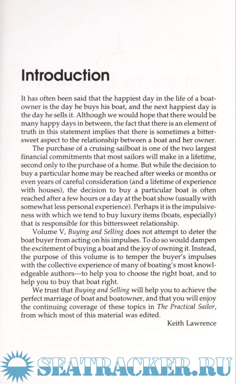 Volume V, Buying and Selling does not attempt to deter the boat buyer from acting on his impulses. To do so would dampen the excitement of buying a boat and the joy of owning it. Instead, the purpose of this volume is to temper the buyer's impulses with the collective experience of many of boating's most knowl­ edgeable authors-to help you to choose the right boat, and to help you to buy that boat right.
