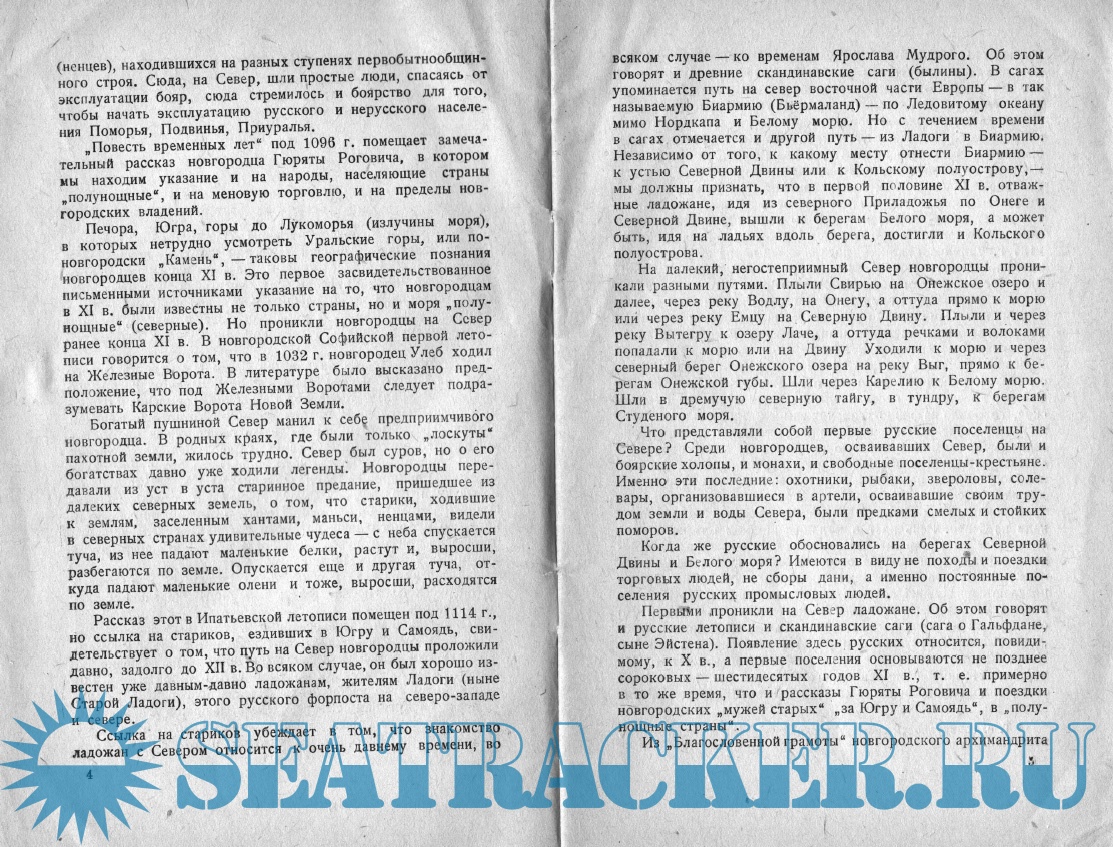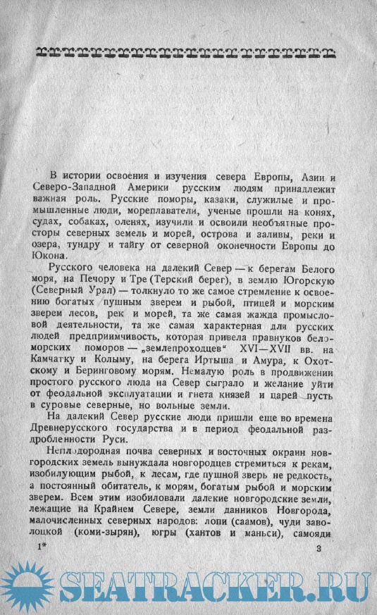 Год выпуска: 1955 Язык: русский Автор: В.В. Мавродин Жанр: История Издательство: Всероссийское общество по распространению полит и научных знаний Формат: PDF Качество: Отсканированные страницы Количество страниц: 36 Описание: Удивительное издание Советского историка, специалиста по истории древнерусской государственности и этнической истории русского народа В.В. Мавродина доктора исторических наук, профессор исторического факультета ЛГУ. В брошюре захватывающе интересно, с историческими фактами описывается освоение Севера русскими поморами и казаками с древних времён до 16 века. Север становился ареной борьбы между Россией и враждебными ей государствами. Во время русско-шведской войны Иван III предпринял поход на Крайний Север Европы. В конце XVI в. русские уже ходили уже морем из Северной Двины на Енисей, а возможно, и далее; у них сложилось убеждение, что "теплое море" продолжается далеко на восток.