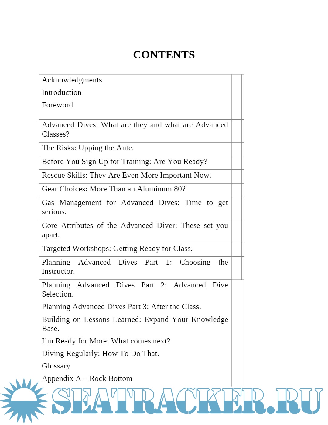 Unfortunately some advanced classes are no more than a "taste" or "tour" of advanced level dives. The divers do not get the new knowledge and skills required to safely embark on these dives. In order to safely pursue these dives James has outlined the steps to take to reduce the risk of injury and worse. From describing the dives to offering advice on the content one should expect, as well as selecting an instructor, he offers new and not so new divers guidance. Additional sections on equipment options, air supply management, dive planning, and dive selection for maximum learning potential are looked at.