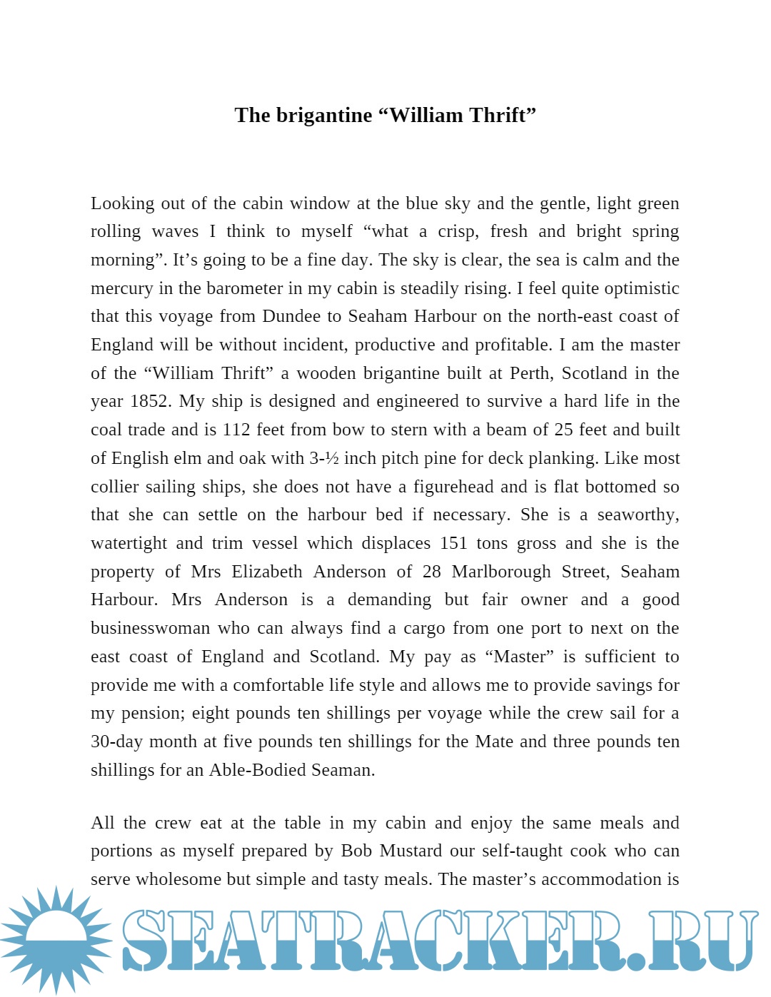 County Durham to coal hungry counties on the East of England. It takes the reader on a journey, building their knowledge of the coast; the sea; the sailing ships on which they worked; the town of Seaham; the daily life of mariners and culminates in a tale of adventure on the high seas with a twist of irony that demonstrates so very clearly how fragile the lives of mariners were in the days of sailing ships.