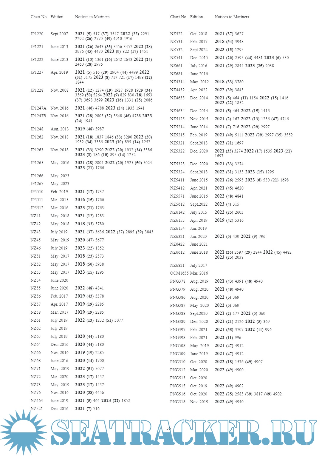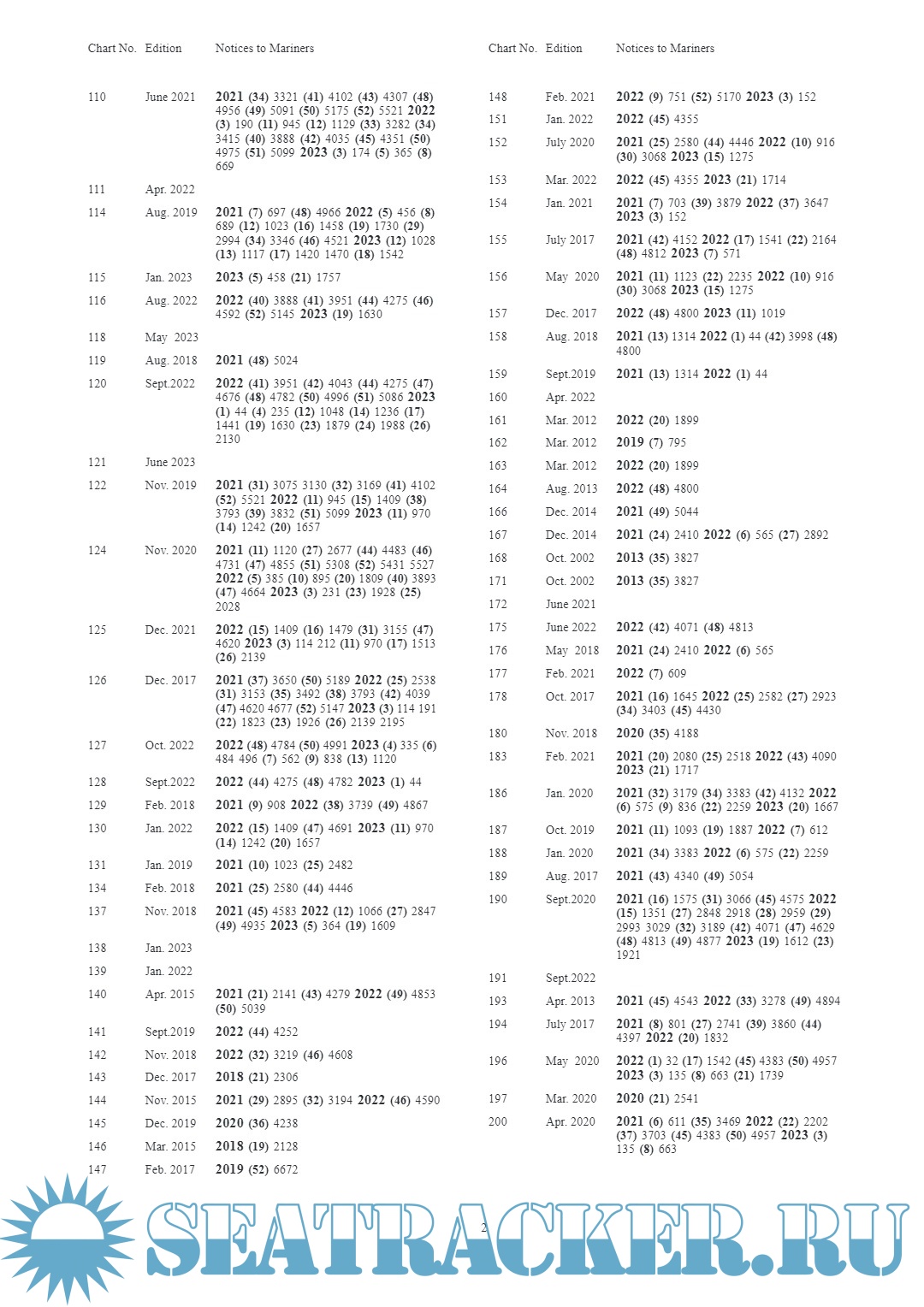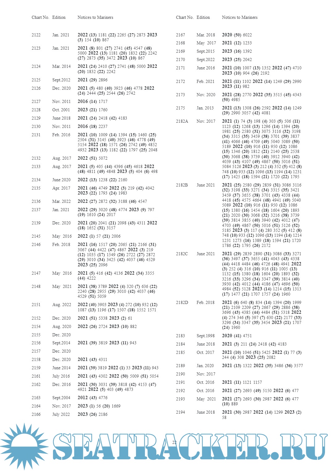 Description: The Cumulative List of ADMIRALTY Notices to Mariners (NP234 A) can help you to identify outstanding NMs and audit trails for a particular chart or charts.