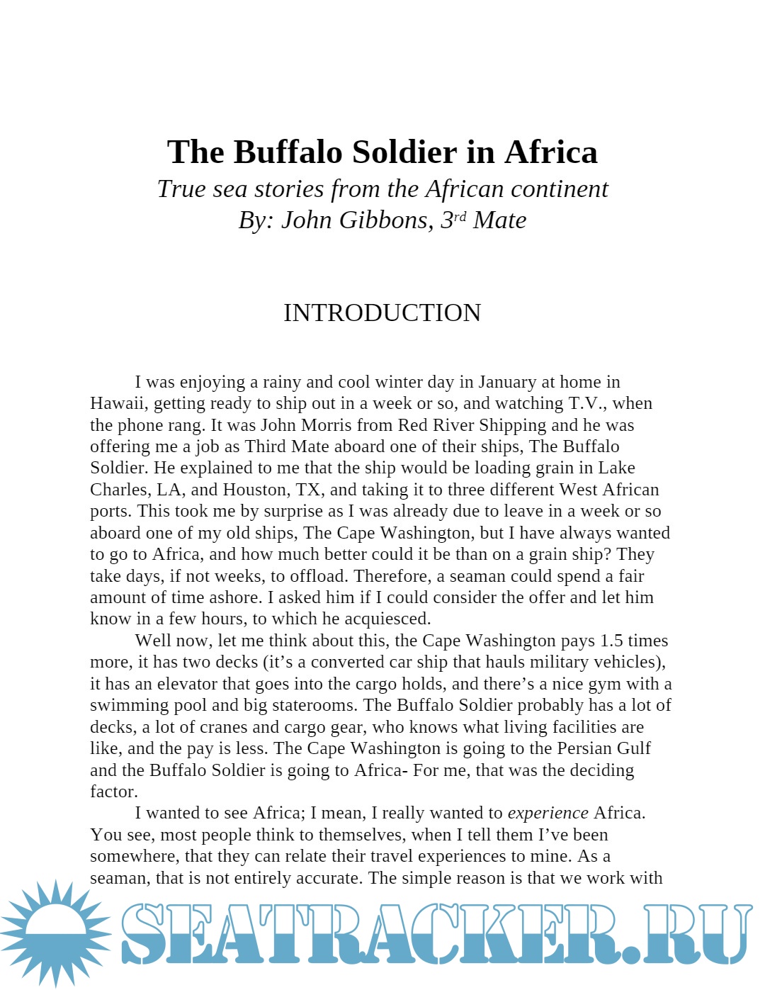 Description: This book contains two short Sea Stories. These stories will take you right into what life aboard a merchant ship for months at a time is like Part one is about my time as a young Third Mate aboard the M/V Buffalo Soldier, a cargo ship laden with food from the USA bound for West Africa. Part two is chronicles of time spent aboard my first five ships as a Able Seaman. Voyages include destinations such as the Panama Canal, Suez Canal, Spain, Persian Gulf, Malta, Hawaii and coastal USA. In both true life sea going adventure books I take you aboard to meet the crew of the ships and introduce you to our daily ship board routines. Loading and unloading cargo, navigation, mooring and of course storms at sea as well tranquil days at sea that are magically beautiful.