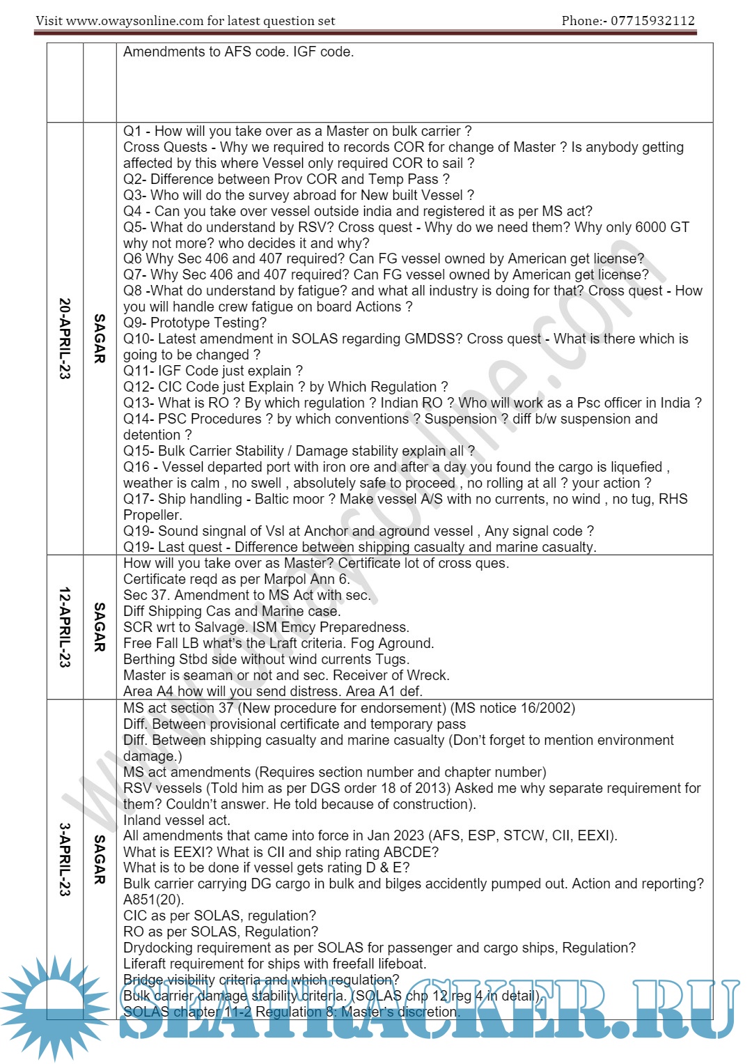 Orals Question Bank (July 2023) for ASM (Advanced Shipboard Management) / Master's Mercantile Marine Department (MMD), India Examinations