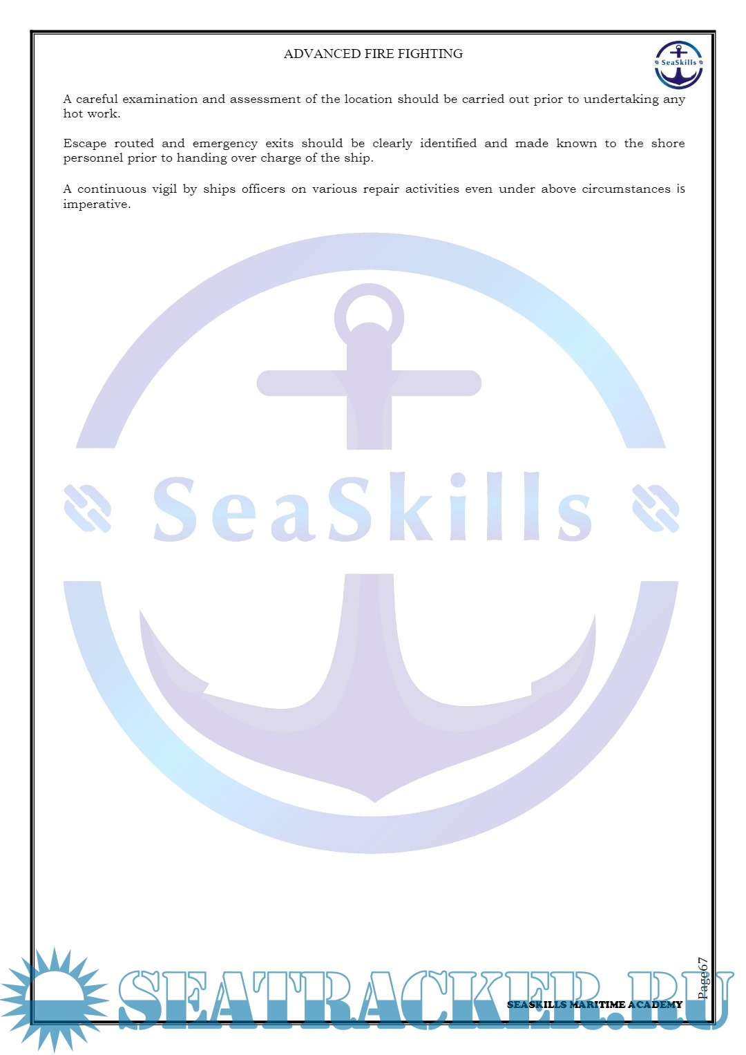 Year: 20xx Language: english Author: Seaskills Maritime Academy Genre: Training courses Publisher: Seaskills Maritime Academy, Coimbatore, India Format: PDF Quality: eBook Pages count: 138 Description: Advanced Fire Fighting training course handout.