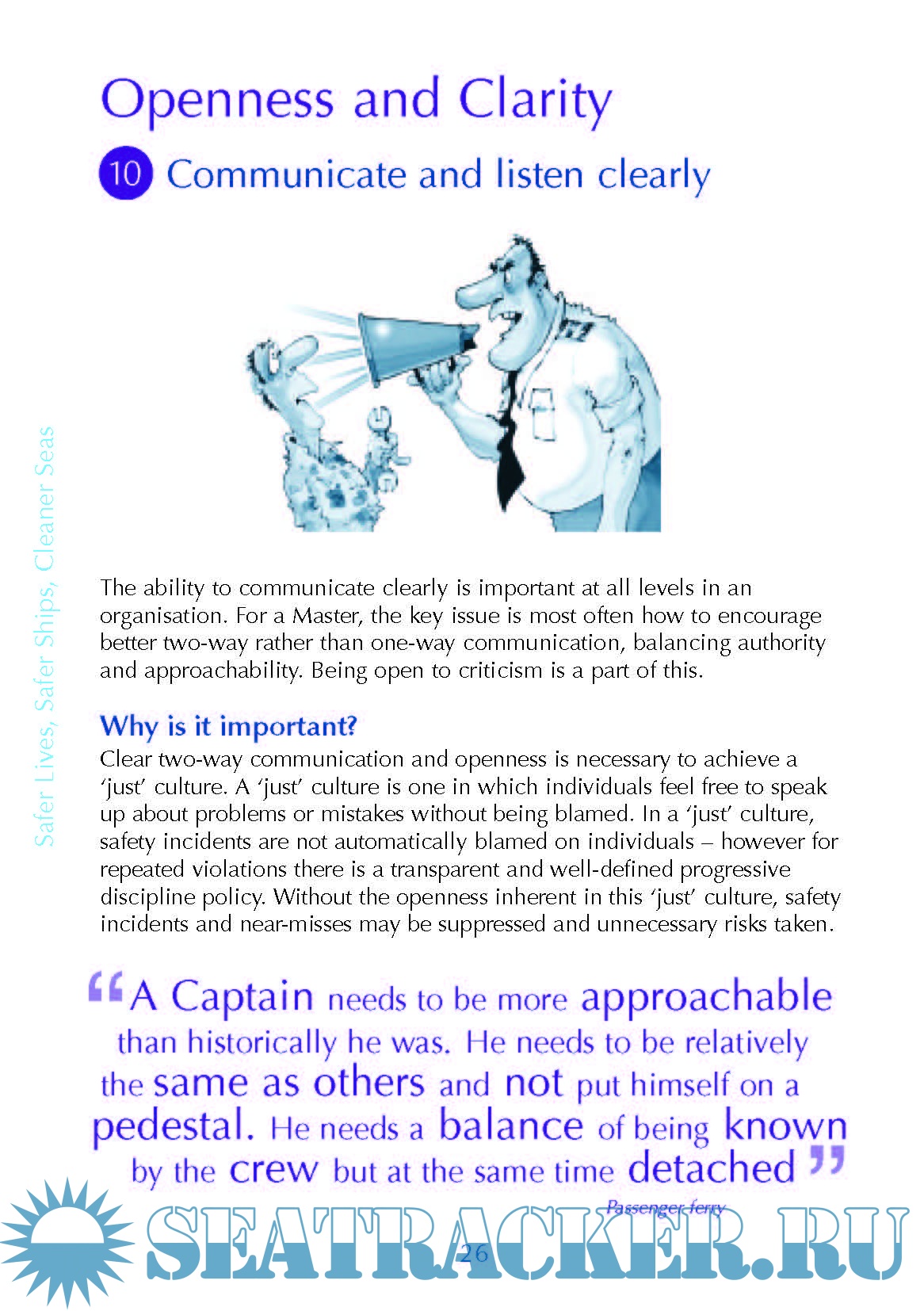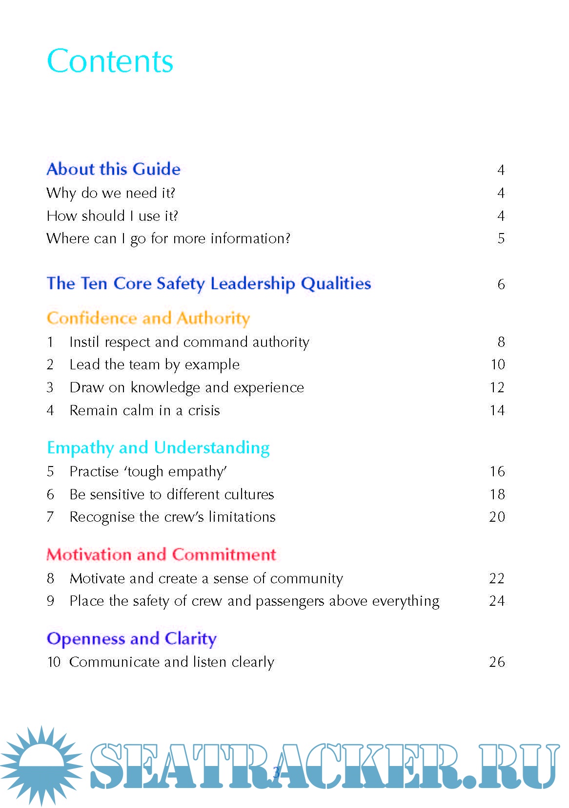 Description: This guide from the Maritime and Coastguard Agency (MCA) aims to help leaders and senior officers in the maritime industry improve their leadership and people management skills in order to ensure safe operations. It contains tips and best practices for 10 core leadership qualities for effective safety leadership, split into 4 categories.