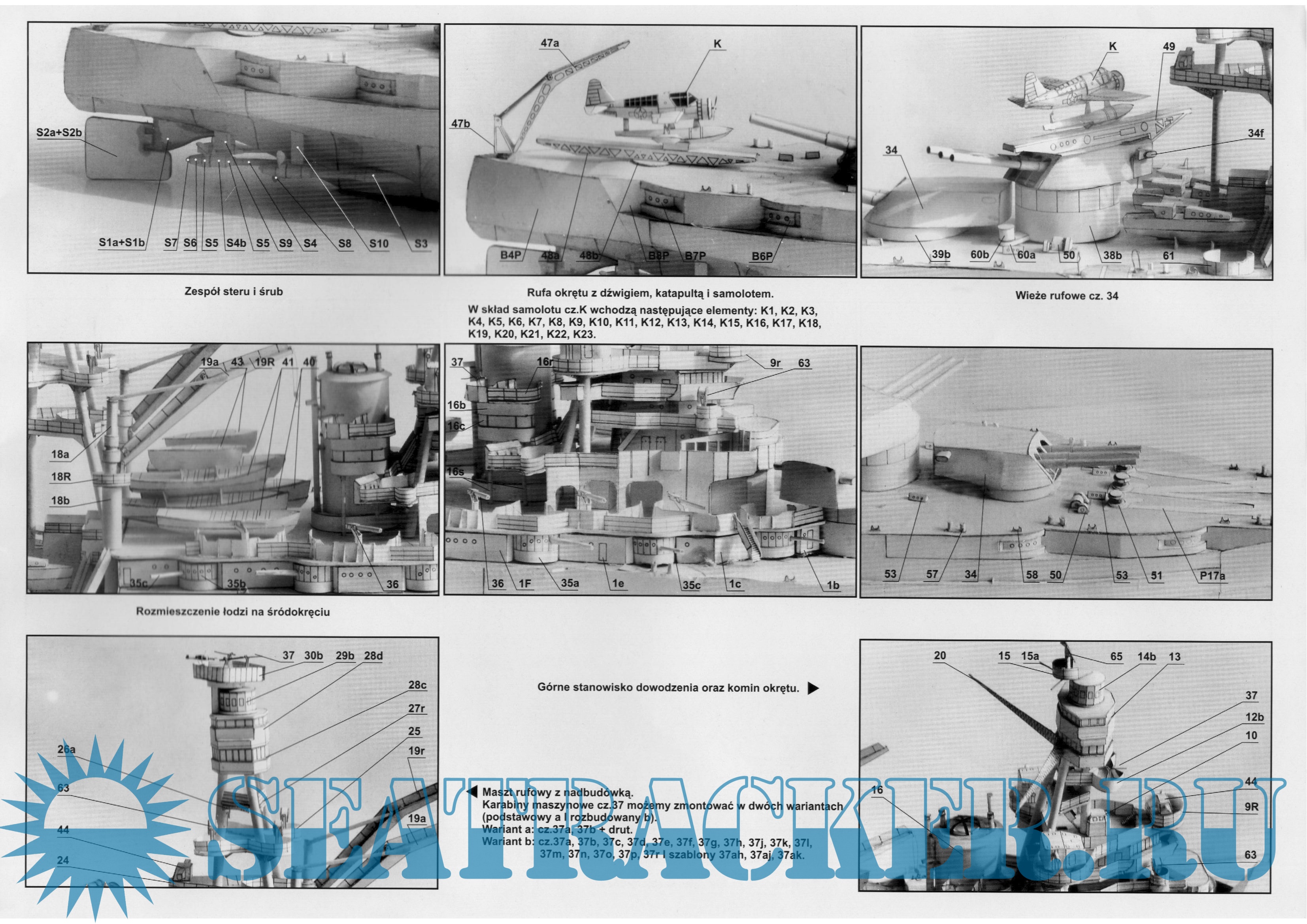 31 лист цветных выкроек и инструкций для изготовления бумажной модели линейного корабля США USS "Arizona" BB-39 масштабе 1:200
