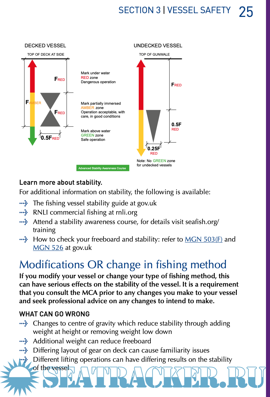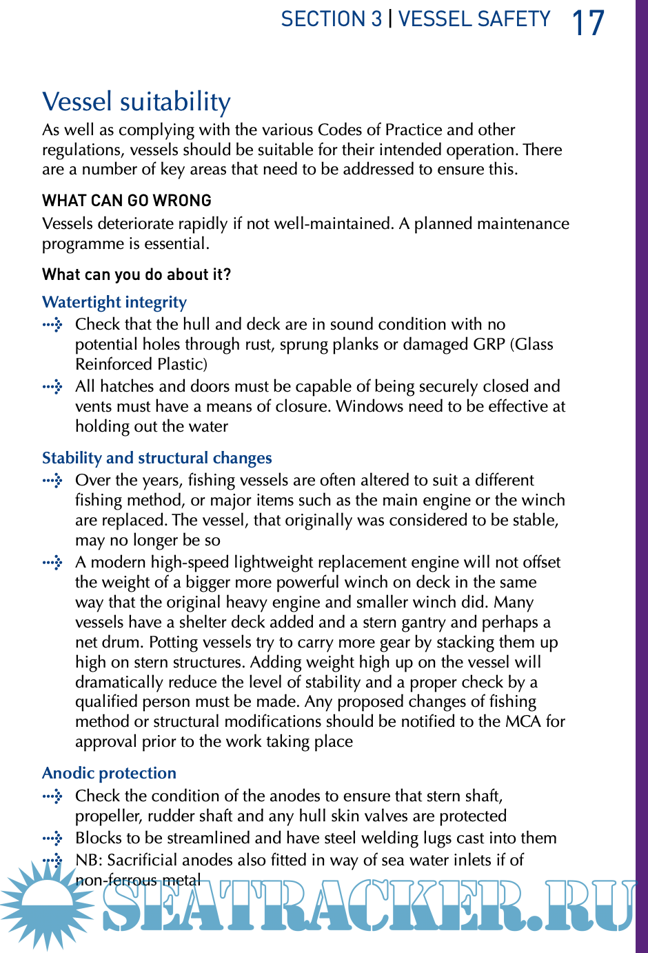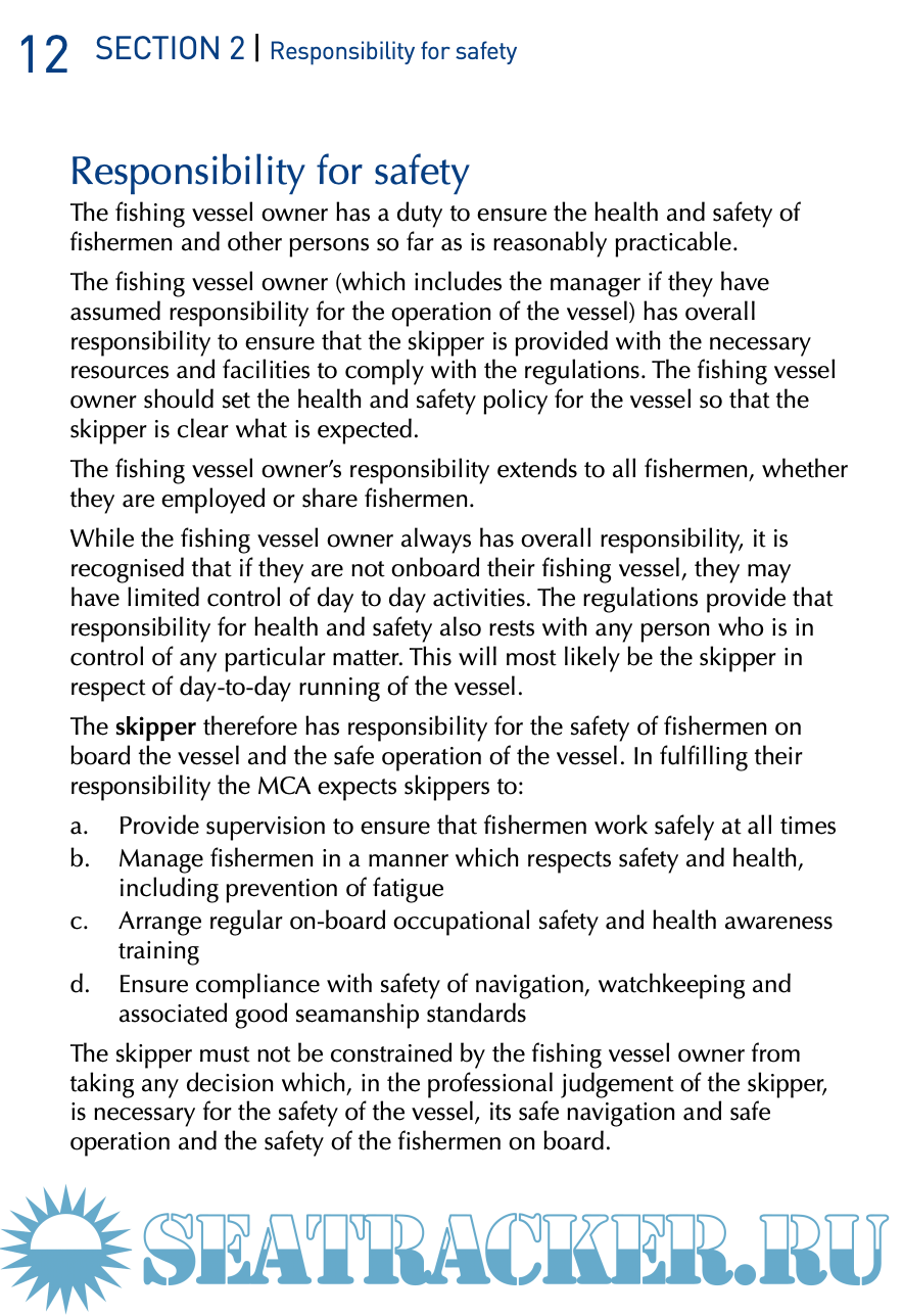 Year: 2020 Language: english Author: MCA Genre: Guide Publisher: MCA Format: PDF Quality: eBook Pages count: 100 Description: Safety applies to everyone in the fishing industry; beginners, experienced crew members, mates, engineers, skippers and owners. Everyone involved has a role in safety and safe vessel operation and this guide is intended to provide guidance and to promote safety awareness to all. GET MORE ONLINE The online version of this guide includes links to MGNs, MSNs and other online resources, for example the Safety Folder, websites and email addresses for other organisations. To read the regulations listed in the printed copy of this guide, go to gov.uk and use the search box. Type in for example: MGN 587 into the search box and you will get a link to the full guidance. Read this document online for quick links and guidance updates: www.gov.uk/government/publications/fishermens-safety-guide Additional info: Older version 2015 here in tracker: https://seatracker.info/viewtopic.php?t=29828