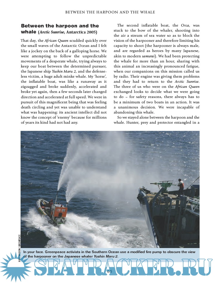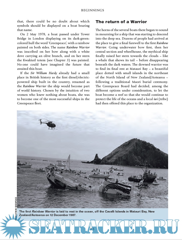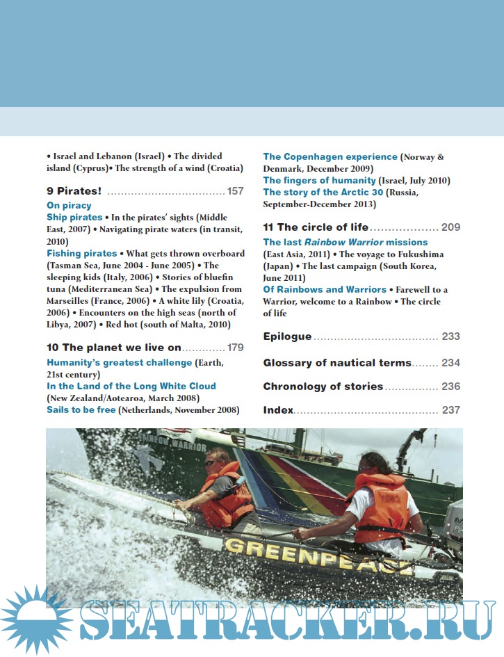 It is at once a narrative of real life on board, a history of some of the most famous vessels in the world, and also a history of Greenpeace itself, which goes beyond the oceans and touches on many aspects of the organization's work. In the end though it aims to bring out the personal stories and firsthand accounts of the ships' adventures—tales from the high seas, full of action and daring but also of humanity and great compassion.