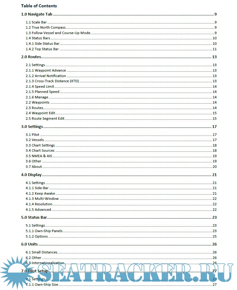 Year: 2020 Language: English Author: OneOcean Genre: Technical literature Format: PDF Quality: eBook Number of pages: 106 Description: What is SeaTab? A turn-key solution providing instant situational awareness and portable ENC viewing. SeaTab’s easy-to-use interface provides live vessel position with AIS Pilot Plug or GPS unit to identify where the vessels are in the vicinity on official ENCs. SeaTab, as a portable solution, is an ideal tool for tendering groups of passengers, giving the crew instant visibility, situational awareness, and confidence of navigating on official electronic charts even away from the bridge. The combination of enhanced kernel capability to render ENC faster and Official ENCs on a portable device provides instant navigational visibility in real time. It can also be an effective portable training tool shore-side and seamlessly connects with the ecosystem of OneOcean products for efficient collaboration between vessel and office. What it enables Visibility - Greater efficiency and visibility in navigational emergencies Portable and available - Keep abreast of the passage wherever located on a vessel Emergency response tool - Supports emergency response actions with a 50NM situation awareness, enabling navigation to safety and avoiding potential collisions Paper free -Reduces paper chart inventory, saving time and money How it does this Easy-to-use interface -Simple to use with no training required Live positioning -Live vessel position with AIS Pilot Plug or GPS unit Video and audio communication -Video and audio recording capability for ship to shore communication Simulation -Aid in collision avoidance decision making in case of a navigational emergency Mitigate cyber threats -Greatly limits the risk of cyber threats as a portable device with a locked version of windows and pre-loaded software. How to use this guide This comprehensive user guide is organized around the Tabs at the base of the SeaTab application. Throughout this guide there are Tips (in green) and Notes (in blue) to advise and warn about key features of OneOcean SeaTab. • Navigate - Display marine charts and navigation objects • Status - Status bar showing important information • AIS - View current AIS targets • Routes – View, edit routes and waypoints • Settings - Adjust settings to control operation of the application • Quick – User customized menu of commonly used settings