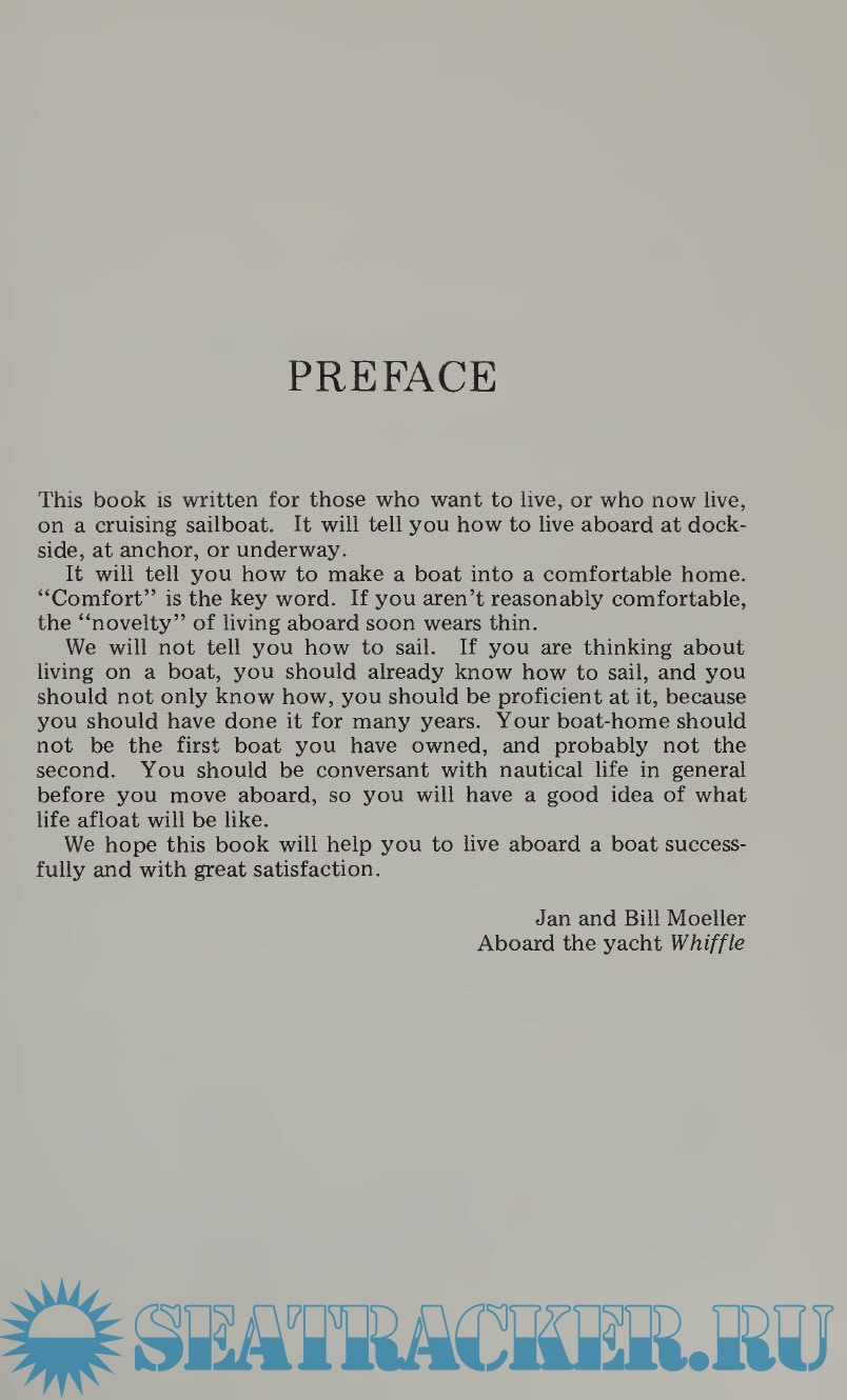 Living Aboard serves equally well those who plan to move onto a boat and those who already have done so. There are descriptions of 11 boat designs that make comfortable boat homes (and the Moellers stress comfort and livability as necessary virtues of the live- aboard boat); there are chapters on electronic equipment, safety gear, stowage, ventilation, maintenance, and more. Particularly useful is the chapter on the unique problems faced by liveaboards — practical solutions are offered for each of them.