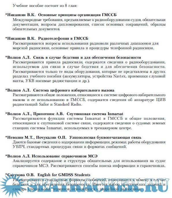 Предназначено для судоводителей, обучающихся на курсах операторов ГМССБ, начальников судовых радиостанций, проходящих подготовку на диплом Радиоэлектроника 2 класса, и других специалистов ГМССБ.