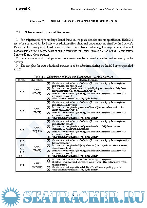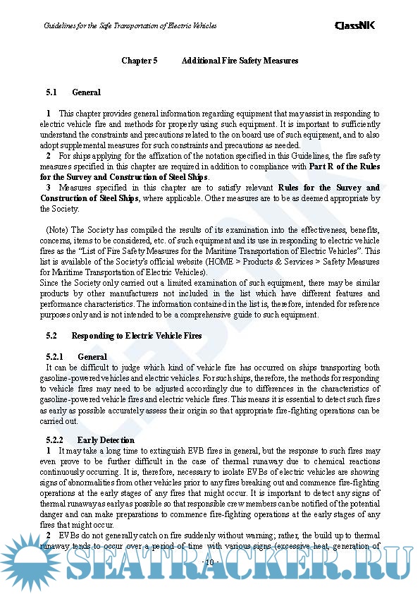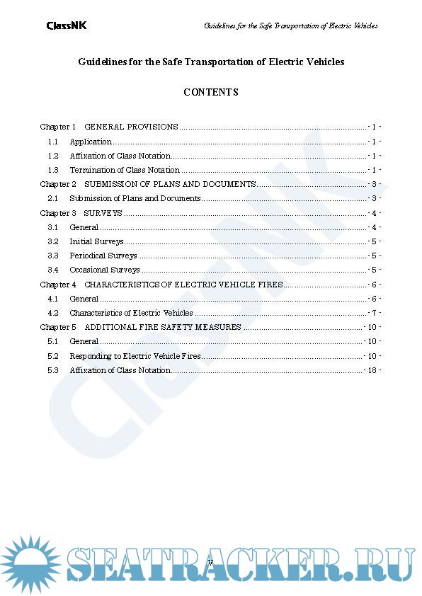Year: 2023 Language: english Author: ClassNK Genre: Normative document Format: PDF Quality: eBook Pages count: 31 Description: This Guidelines provides vehicle carrier owners and management companies with useful information and a framework regarding voluntary and advanced fire safety measures for the maritime transportation of electric vehicles. The explanation for characteristics of electric vehicle fires is specified in Chapter 5, with aim of sharing necessary knowledge for establishing fire measures. Furthermore, the explanation of the guidelines for such fires including example measures are specified in Chapter 6 based on the characteristics of electric vehicle fires specified in Chapter 5.