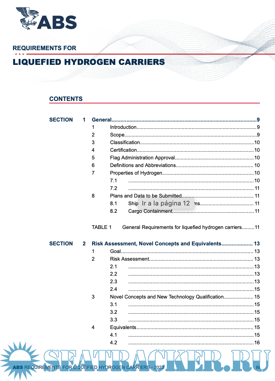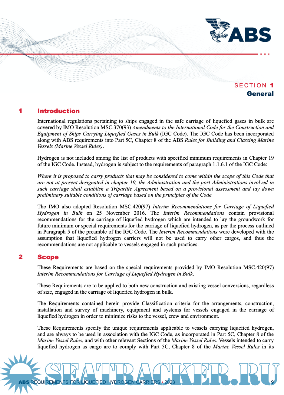 Year: 2023 Language: english Author: ABS Genre: Guide Publisher: ABS Edition: 1 Format: PDF Quality: eBook Pages count: 42 Description: There is an increased commitment from the International Maritime Organization (IMO) to reduce Green House Gas (GHG) emissions from shipping through the use of gases or low-flashpoint fuels such as hydrogen, ammonia, methane, methanol, or their e-fuel variants produced from non-fossil fuel sources. These fuels are expected to become more widely adopted by the marine industry as a substitute for conventional residual or distillate marine fuels. In response to the IMO GHG reduction targets, the marine industry has increased its interest in the use and transport of hydrogen due to its properties as a zero- emission fuel and the ability to produce hydrogen from renewable and sustainable sources. This document addresses the carriage of liquefied hydrogen in bulk. The ABS criteria to be applied to liquefied gas carriers are detailed in Part 5C, Chapter 8 of the ABS Rules for Building and Classing Marine Vessels (Marine Vessel Rules), which incorporates the IMO Resolution MSC.370(93) Amendments to the International Code for the Construction and Equipment of Ships Carrying Liquefied Gases in Bulk (IGC Code).