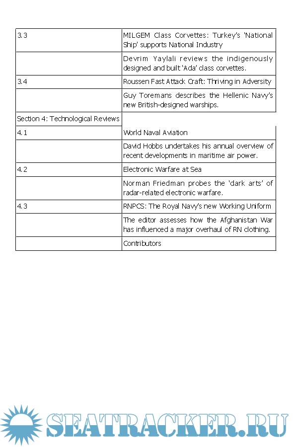 This edition includes a detailed look at the Royal Navy as it faces the latest defense review, an evaluation of the Indonesian Navy, and information on the U.S. Navy's San Antonio class amphibious transporters. It also features technological reviews dealing with naval aviation by David Hobbs and Norman Friedman.