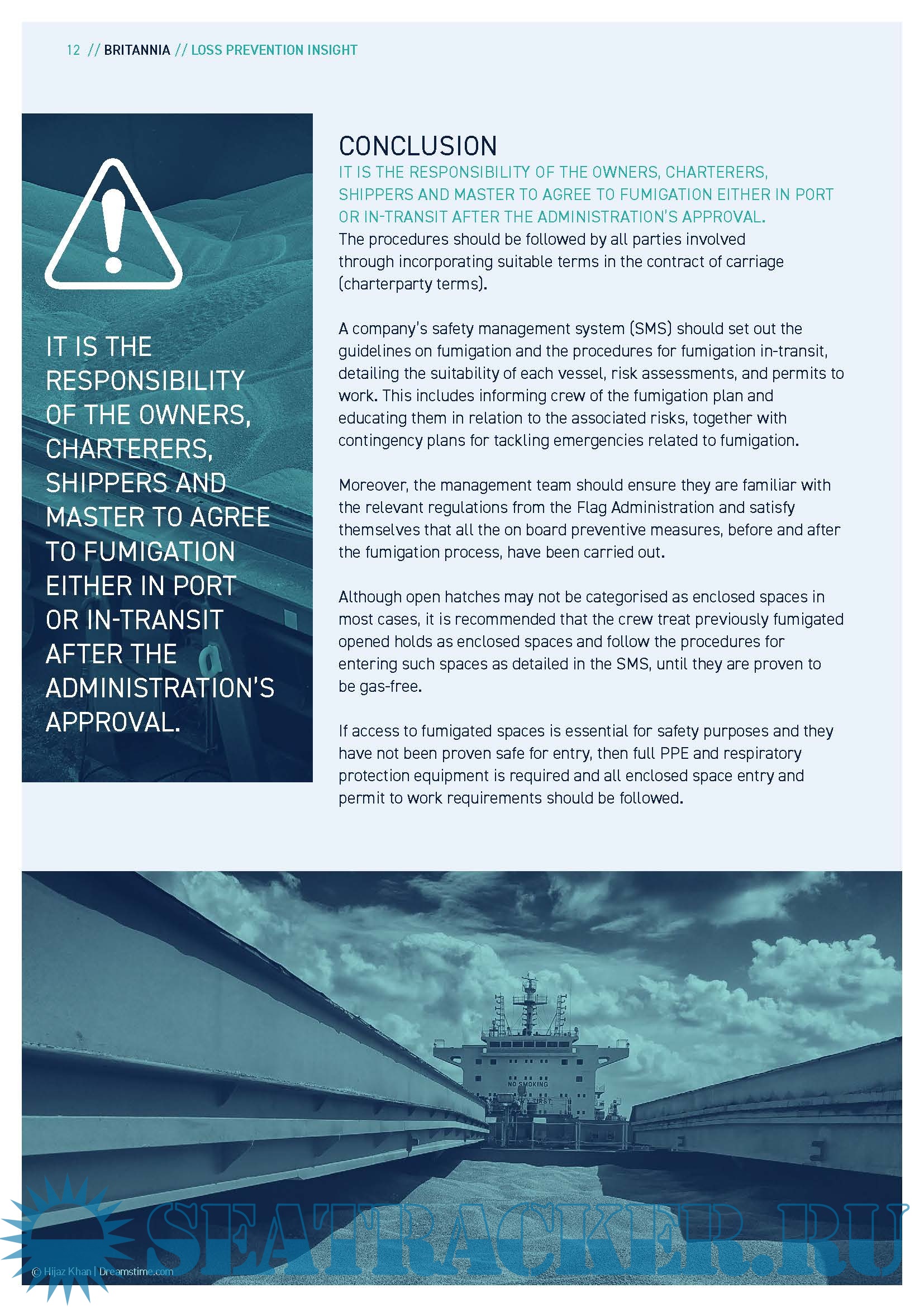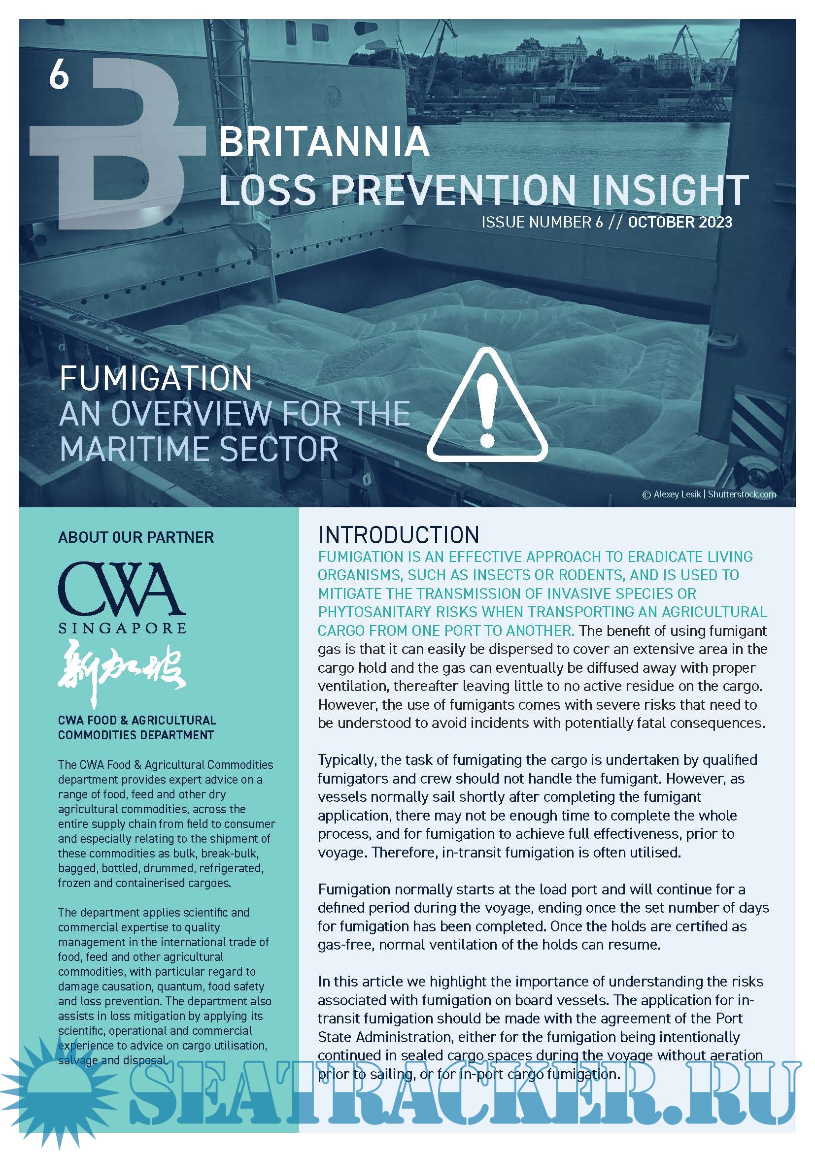Year: 2023 Language: english Author: Britannia P&I Club Genre: Periodical (magazine) Format: PDF Quality: eBook Pages count: 14 Description: Britannia Loss Prevention Insight issue number 6 / October, 2023 In this article highlighted the importance of understanding the risks associated with fumigation on board vessels. The application for in-transit fumigation should be made with the agreement of the Port State Administration, either for the fumigation being intentionally continued in sealed cargo spaces during the voyage without aeration prior to sailing, or for in-port cargo fumigation.