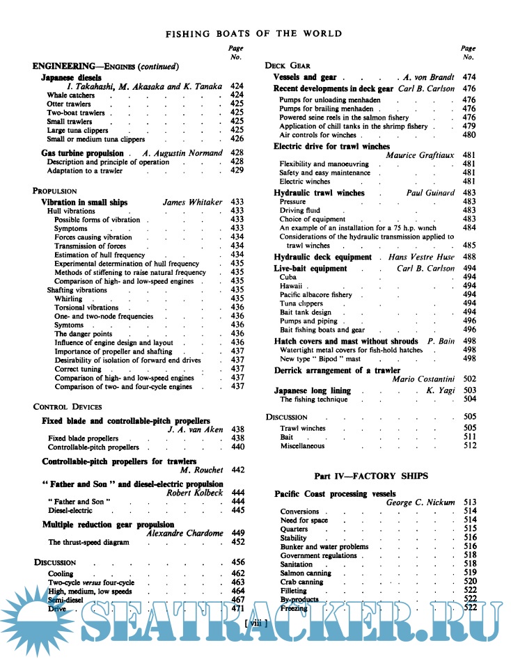 Description: This is the first of three volumes, covering types of boats for various fishing methods, combined fishing and research vessels, marine architecture with regard to hull shape and safety at sea, engines, propulsion systems, control devices and deck equipment, factory vessels. The books are based on the International Fishing Boat Congress of the Food and Agriculture Organization in Paris and Miami.