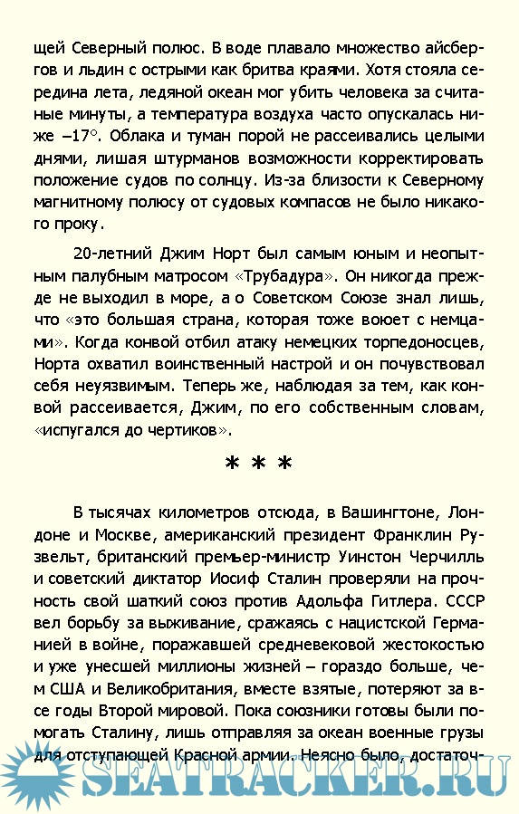 4 июля 1942 года, когда конвой PQ-17 получил приказ рассеяться, четыре корабля из его состава, отделившись от остальных, направились дальше на север, в опасные арктические льды. Нескончаемый полярный день не давал морякам передышки от налетов бомбардировщиков, по следам судов шли вражеские подводные лодки, а у норвежских берегов стоял, готовый выйти наперехват, грозный линкор «Тирпиц», самый большой боевой корабль кригсмарине — военно-морских сил Германии. Но, несмотря на все риски, остатки PQ-17 продолжали свой путь, чтобы доставить ценные грузы в Советский Союз