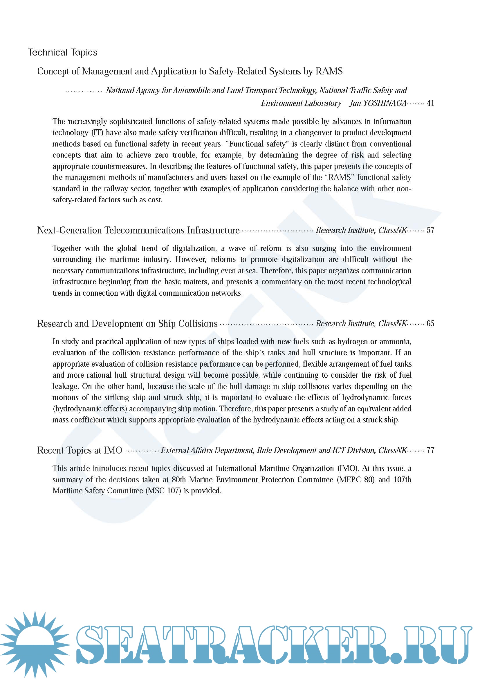 This release also features technical articles on the concept in management and its application of safety-related systems using the example of the “RAMS” which is the functional safety standard in the railway sector, next-generation telecommunication infrastructure, research and development on ship collisions, and recent topics at IMO’s MEPC80 and MSC107.