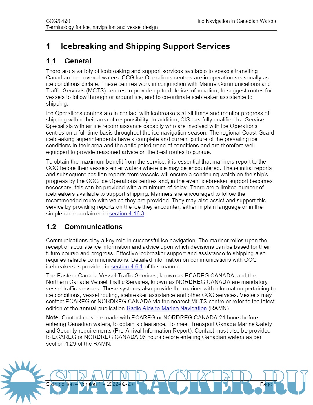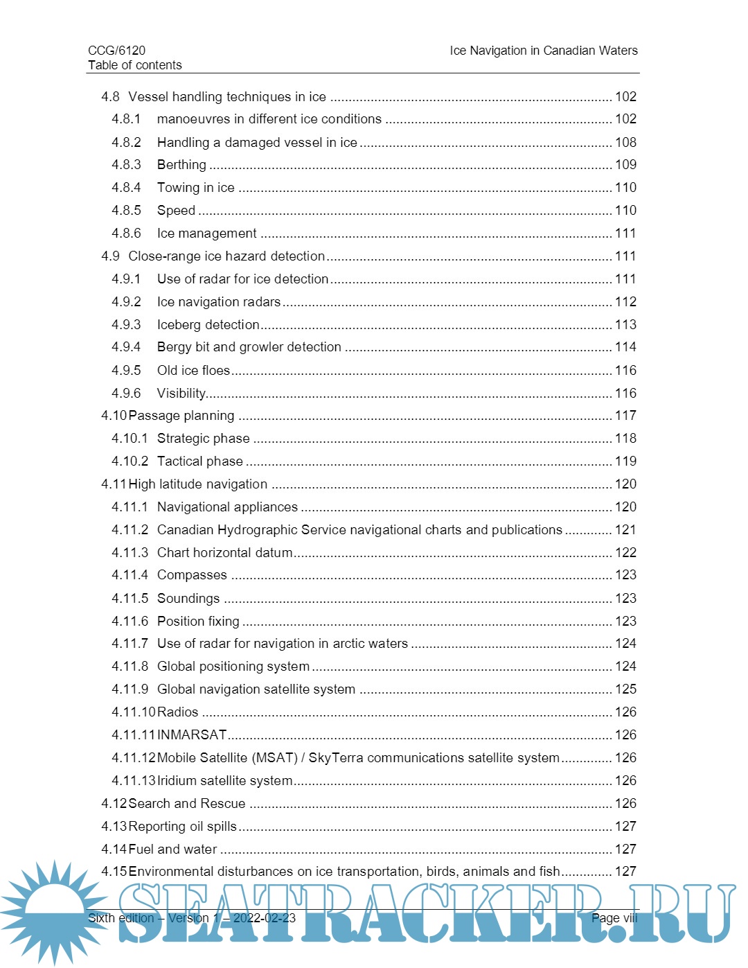 Year: 2022 Language: english Author: Canadian Coast Guard Genre: Guide Publisher: Government of Canada Edition: 6 ISBN: 978-1-100-20610-3 Format: PDF Quality: eBook Pages count: 180 Description: The publication is intended to assist vessels operating in ice in all Canadian waters, including the Arctic. This document will provide mariners of vessels transiting Canadian ice-covered waters with the necessary understanding of the regulations, shipping support services, hazards and navigation techniques in ice.
