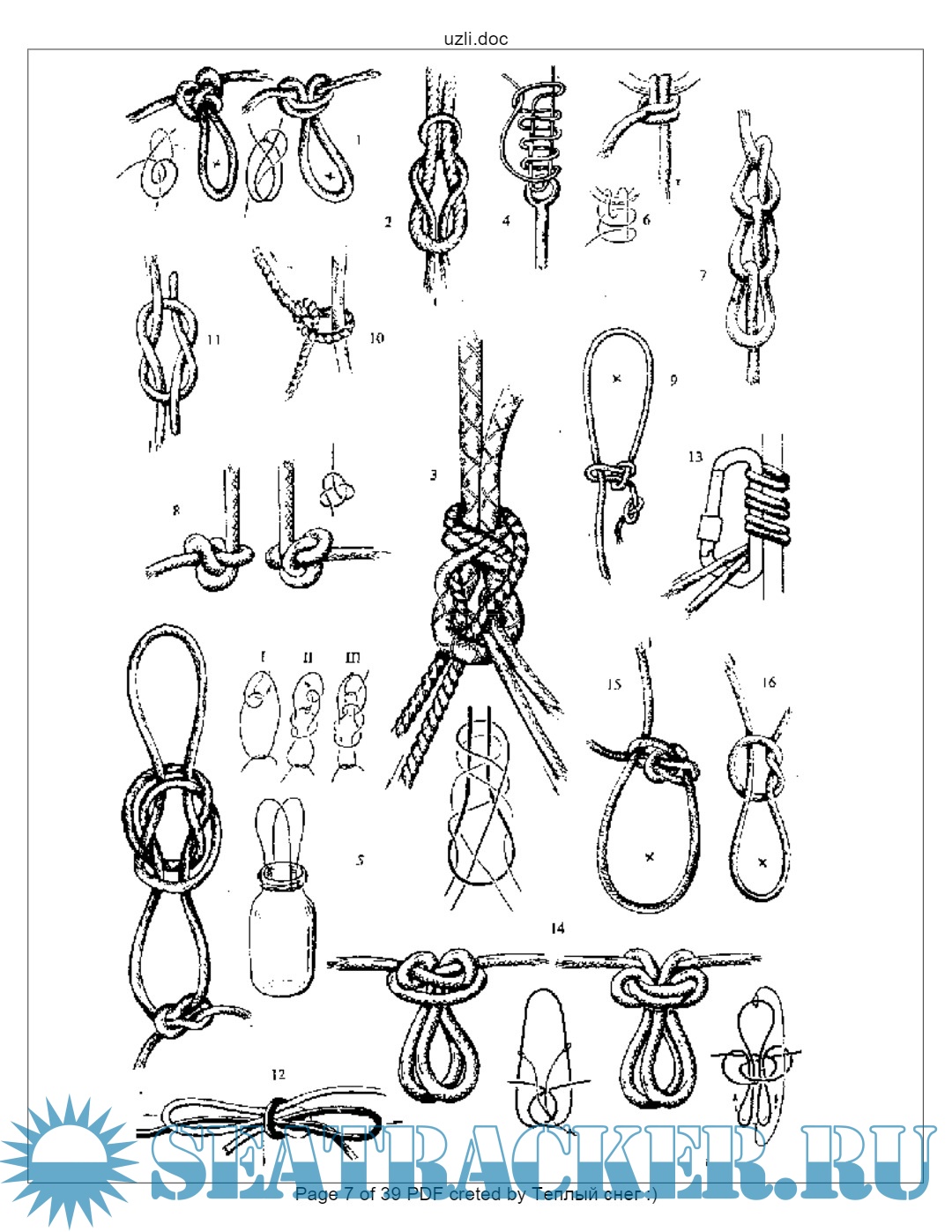 Год выпуска: 20XX Язык: русский Автор: YurikGL Издательство: : библиотека Туристско-Спортивного Союза Республики Башкортостан Формат: PDF Качество: Изначально компьютерное (eBook) Количество страниц: 39 Описание: Техника вязки узлов берет свое начало с незапамятных времен. Самые древние узлы были найдены в Финляндии, они датируются неолитом (поздним каменным веком). Несомненно, узлы вились людьми и раньше, но, к сожалению, не сохранились. Гибкие материалы были основным крепежным подспорьем, работая с которыми человек создавал изделия труда, оружие и различные приспособления. Помимо прямого применения, узлы становятся основным элементом для большой группы изделий декоративно-прикладного характера. На рубеже каменного и бронзового веков выделяется своеобразное искусство вязки узлов и плетений. Появляются особые узлы, имеющие культовое значение (группа священных узлов).