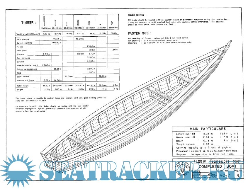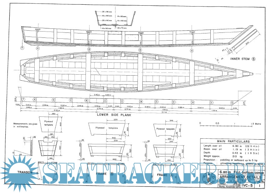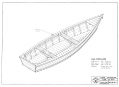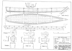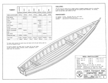 Description: This publication was made in the 70's by the UN for third world countries. The boats are caravel planked (square edge planks) and they tell you to use tar or the equivalent of wildwood between the planking. They are all flat bottom utility types with no cabins or superstructure. Might be a good first build for somebody who doesn't yet have a lot of boat building skills or tools. Plywood sheathing would also work well as the designs have few complex curves. All boats are low HP outboard (20 max for the largest) designs. Would be a good place to start for a first boat, or one to leave at the cottage, hidden in the weeds at your favorite lake, or even as a decorative one hanging in then rafters of your cabin. Lots of ideas. Also has plans for two flat bottom "canoes" with transom sterns that look like oversized pirogues.