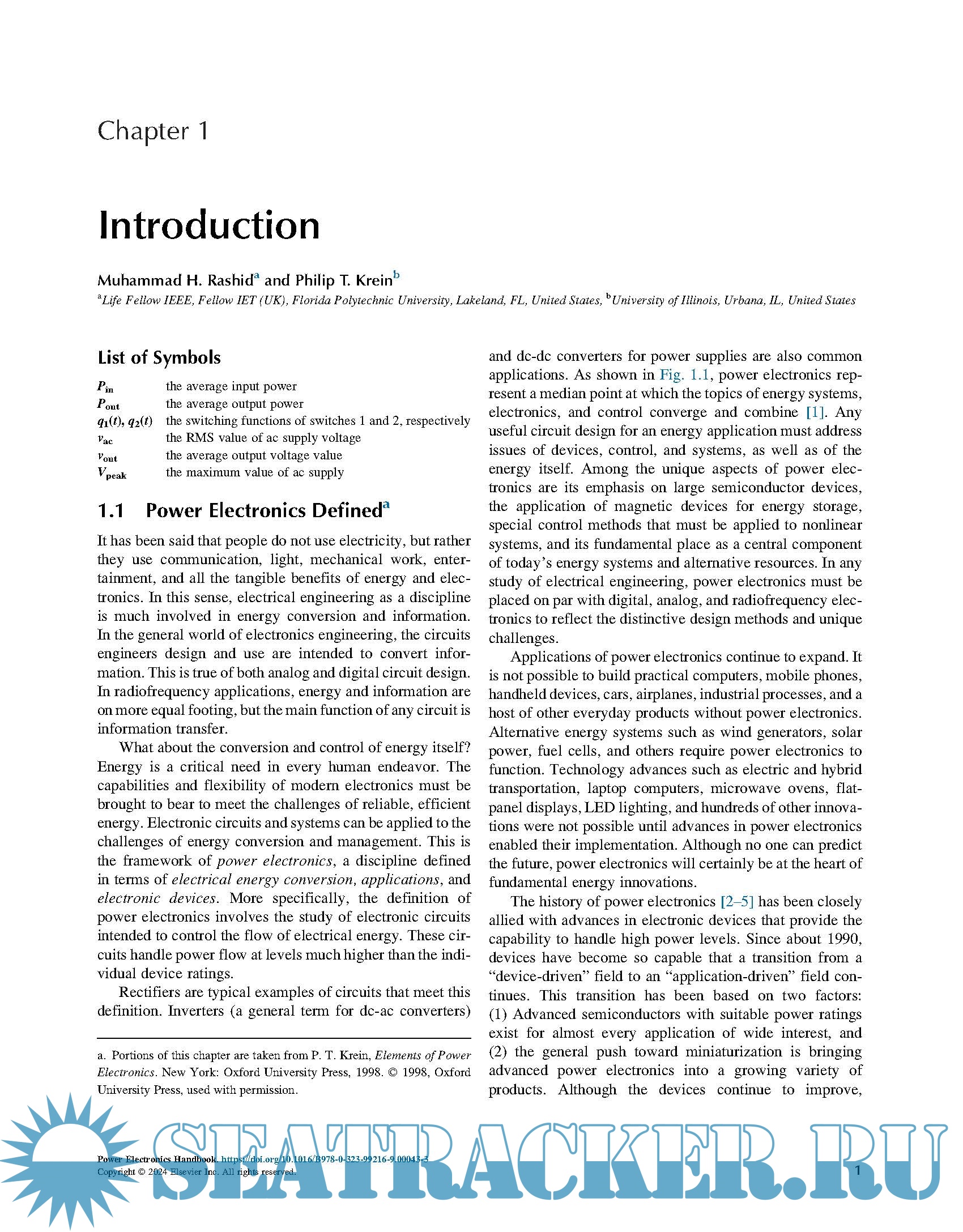 Year: 2024 Language: english Author: Muhammad H. Rashid Genre: Handbook Publisher: Butterworth-Heinemann Edition: 5th (September 27, 2023) ISBN: 9780323992169 Format: PDF Quality: eBook Pages count: 1472 Description: Power Electronics Handbook, Fifth Edition delivers an expert guide to power electronics and their applications. The book examines the foundations of power electronics, power semiconductor devices, and power converters, before reviewing a constellation of modern applications. Comprehensively updated throughout, this new edition features new sections addressing current practices for renewable energy storage, transmission, integration, and operation, as well as smart-grid security, intelligent energy, artificial intelligence, and machine learning applications applied to power electronics, and autonomous and electric vehicles. This handbook is aimed at practitioners and researchers undertaking projects requiring specialist design, analysis, installation, commissioning, and maintenance services. Key Features: • Provides a fully comprehensive work addressing each aspect of power electronics in painstaking depth • Delivers a methodical technical presentation in over 1400 pages • Includes 50+ contributions prepared by leading experts • Offers practical support and guidance with detailed examples and applications for lab and field experimentation • Includes new technical sections on smart-grid security and intelligent energy, artificial intelligence, and machine learning applications applied to power electronics and autonomous and electric vehicles • Features new chapter level templates and a narrative progression to facilitate understanding :