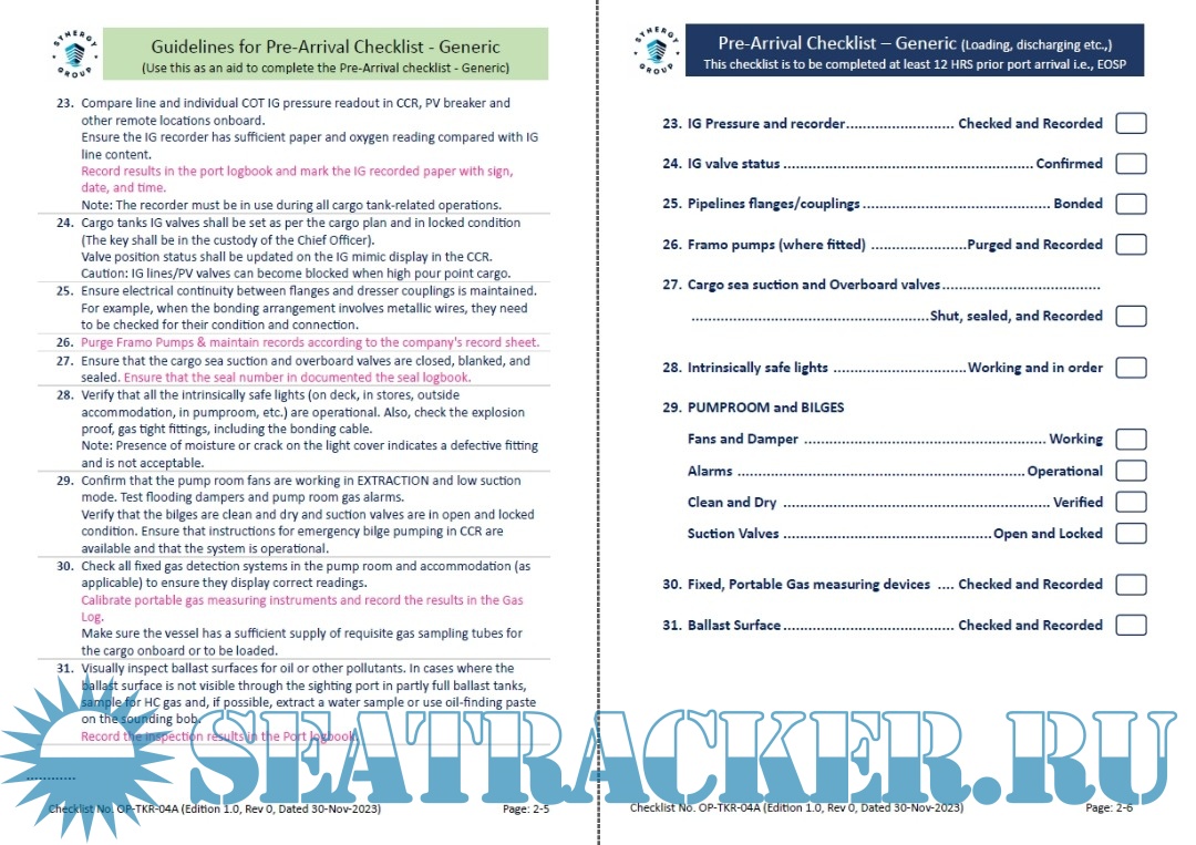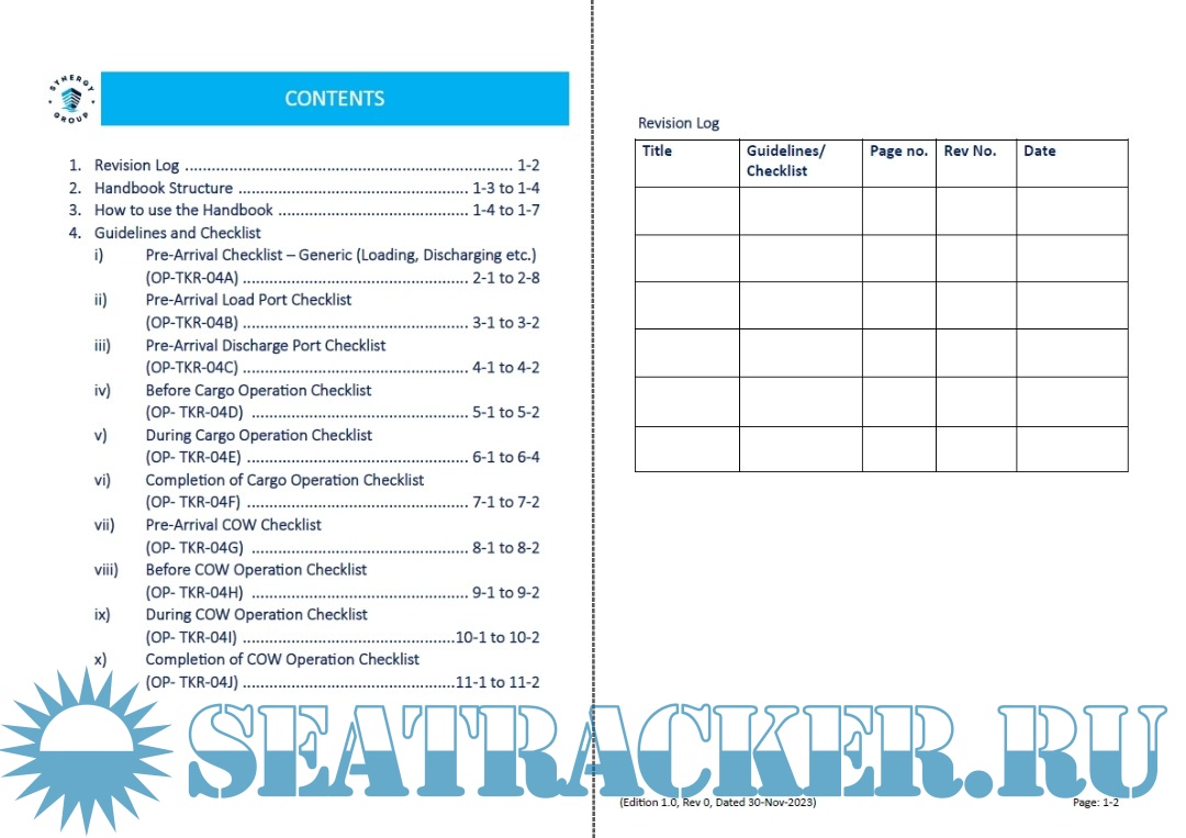 Year: 2023 Language: english Author: Synergy Marine Pte. Ltd. Genre: Handbook Edition: Edition 1.0, Rev 0, Dated 30-Nov-2023 Format: PDF Quality: eBook Pages count: 20 Description: This cargo operation checklist handbook is designed to cater safe cargo operations in line with tne company's cargo oil tanker manual alild industry stalildards. This handbook is applicable to all the Synergy managed tanlkers while carrying MARPOIL Annex I cargo. Tnis handbook does not remove the need for experience and common sense. As a cargo officer you must always assess alild relate tliie critical aspects of the operations and determine the actions whfch are deemed to be the safest.