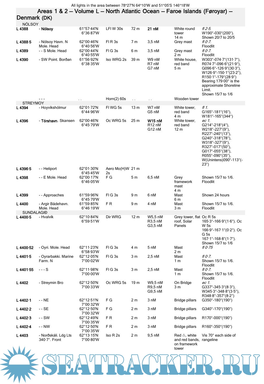 • Details for all lights listed including the international number, location and/or name, geographical position, characteristics and intensity, elevation in metres, range in sea miles and description of structure.