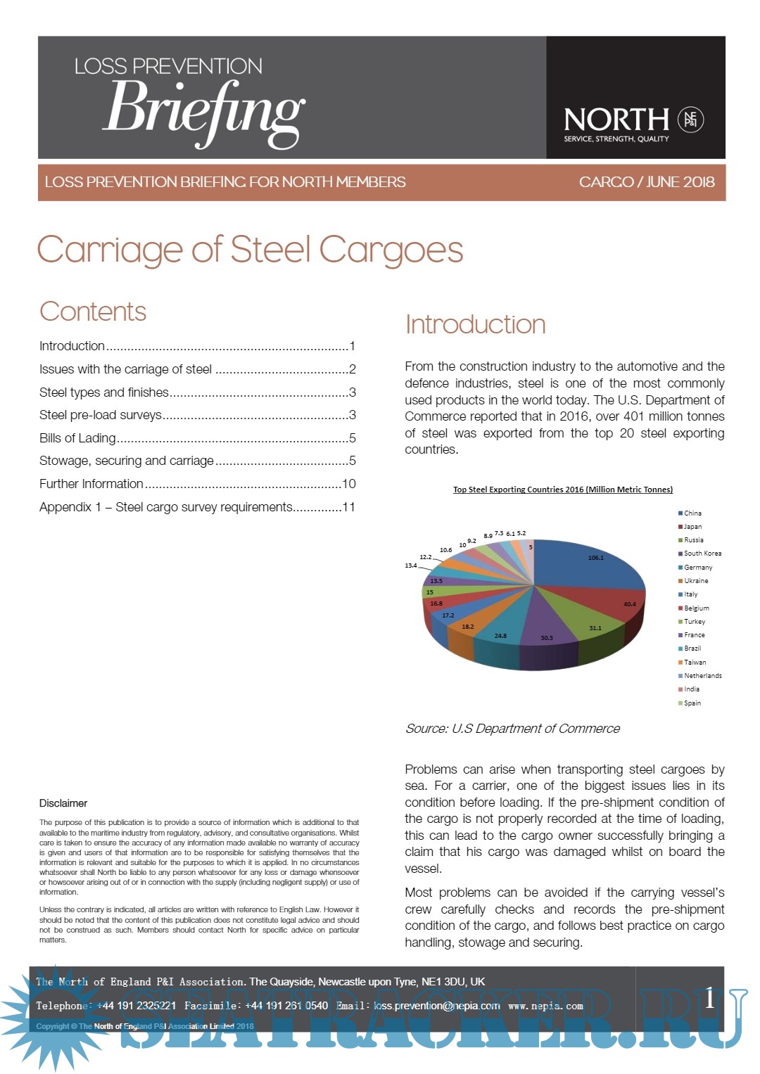 Year: 2018 Language: English Author: The North of England P&I Association. Genre: Practical guide Format: PDF Quality: eBook Pages count: 11 Description: LOSS PREVENTION BRIEFING FOR NORTH MEMBERS From the construction industry to the automotive and the defence industries, steel is one of the most commonly used products in the world today. The U.S. Department of Commerce reported that in 2016, over 401 million tonnes of steel was exported from the top 20 steel exporting countries.