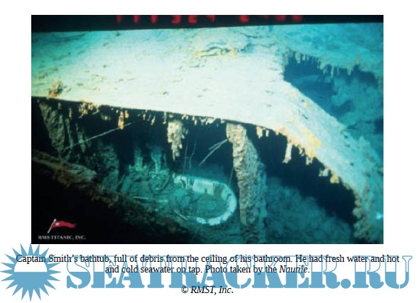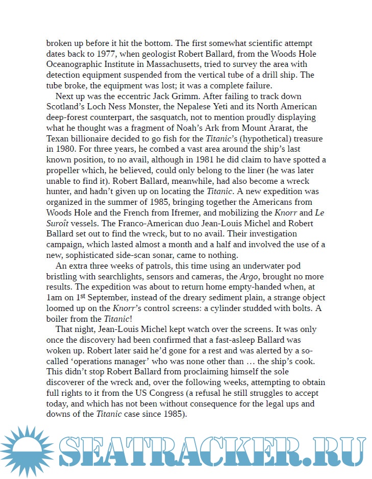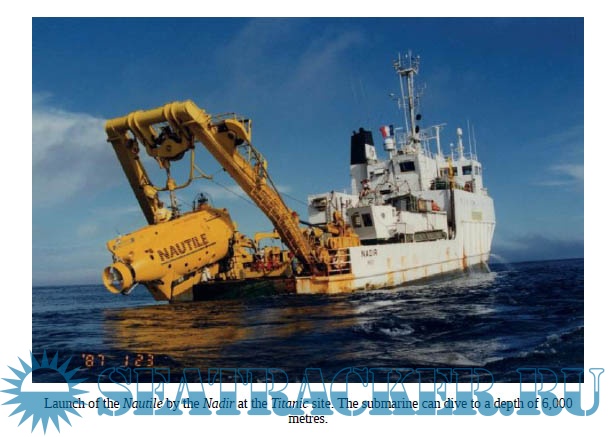 Three scribbled words in the Nautile’s logbook to express the indescribable. The bow of the Titanic had just appeared in our submersible’s searchlights. Instantly, the cabin fell silent. Guy Sciarrone, Max Dubois and I had been exchanging information for the last hour and a half of our descent to the bottom, but no one had said a word for a good ten minutes. Before our eyes rose the incredibly spectacular view of the wreck: the foredeck, with winches and anchor chains, still in place seventy-five years later. The scene was startling. At this depth, marine life is minimal. No rippling seaweed, no carpet of sponges, no gorgonians or multicoloured corals to mask the scrap metal. The only hints of colour were the rusticles – rusty stalactites produced by microorganisms – whose orange colour contrasted with the grey veil of marine sediment and the absolute blackness of the water.