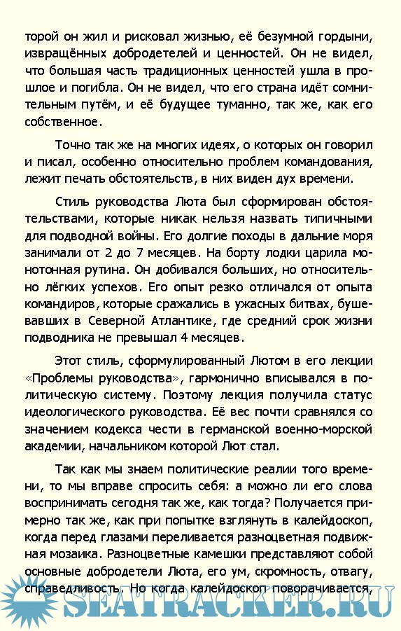 Описание: В книге представлена биография второго по результативности подводника Кригсмарине Вольфганга Люта, который мало известен за пределами Германии. И не удивительно – Лют нарастил свой счёт не в суровых водах Северной Атлантики, а гораздо южнее, имея дело с противником, мало способным оказать сопротивление, причём весьма значительную часть его жертв составили нейтральные суда. То есть его мастерство из количества потопленного тоннажа совершенно не очевидно. Тем не менее, американский военный моряк Джордан Воуз не скрывает своей симпатии к фашистскому подводнику, живописуя его «подвиги» иногда в таком святочно-сусальном стиле, что не замечает многих допущенных «по теме» грубых ошибок. Однако книга несколько приоткрывает картину «войны за тоннаж», которую вели немецкие подводники на отдалённых театрах Второй Мировой, и потому представляет собою определённую ценность.
