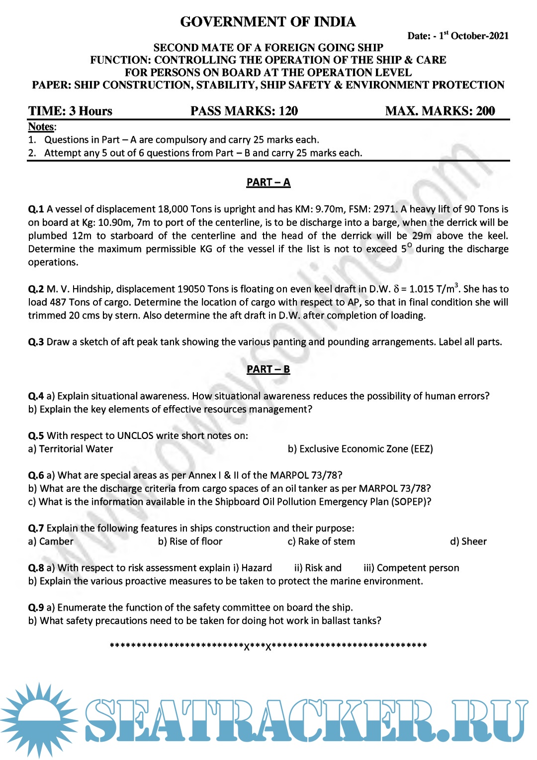 Question Paper Set (March 2023) for Second Mate (F.G.) Mercantile Marine Department (MMD), India…