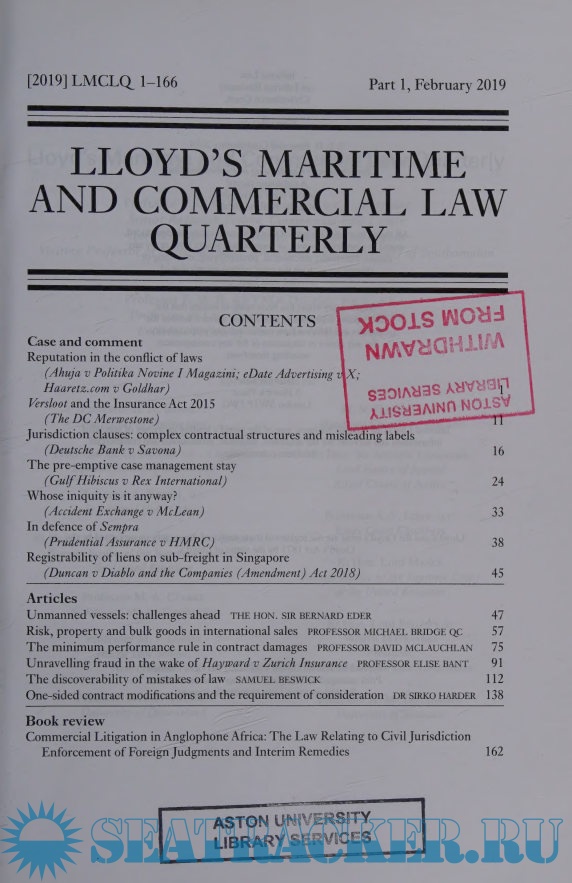 Year: 2019 Language: English Author: F.D Rose Genre: Handbook Publisher: informa Format: PDF Quality: Scanned pages + text layer Pages count: 196 Description: Lloyd’s Maritime and Commercial Law Quarterly is the leading journal internationally on all aspects of shipping and maritime law, international trade, commercial law and associated areas of law. It includes original, thoroughly researched, rigorously analytical and detailed informative contributions for lawyers and practitioners in related areas on the current law and practice, and future development, of the law in the United Kingdom and internationally on arbitration, insurance, litigation, sales, shipping and commercial law generally.